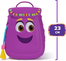 Fialový batôžtek s priateľskou tvárou má praktické otváranie a pojme všetky priložené doplnky – ideálny na cesty aj domáce hranie.