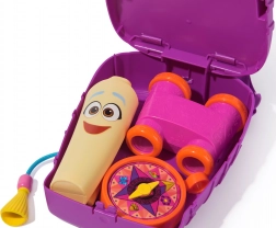 Súčasťou sú tematické pomôcky na hranie sa na objaviteľa: ďalekohľad na približovanie vzdialených objektov, farebný kompas na určenie smeru a vysúvacia mapa s obrázkovou scénou na plánovanie výprav. Perfektná hračka na rozvoj fantázie, role-play a jemnej motoriky.
