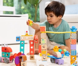 Stavebnica rozvíja kľúčové zručnosti: jemnú motoriku, koordináciu oko–ruka, tvorivosť a logické myslenie. Deti môžu skladať, spájať, točiť a jazdiť s hotovými výtvormi. Kvalitné drevo s certifikáciou FSC a odolné spracovanie zabezpečujú dlhú životnosť aj pri každodennej hre.
