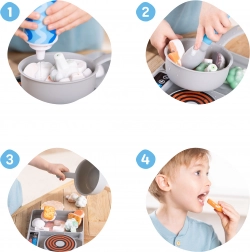 Súčasťou je hrniec, lyžica, fľaštička, rôznofarebné potraviny, obojstranné disky jedál a aktivity karta. Všetko prehľadne usporiadané na jednoduché hranie a odkladanie.