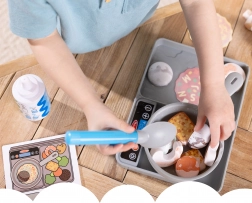 Podnos s imitáciou varnej dosky, hrncom a miešacou lyžicou vytvára realistické prostredie na hru na kuchára. Deti môžu miešať, prelievať a servírovať ako v skutočnej kuchyni.