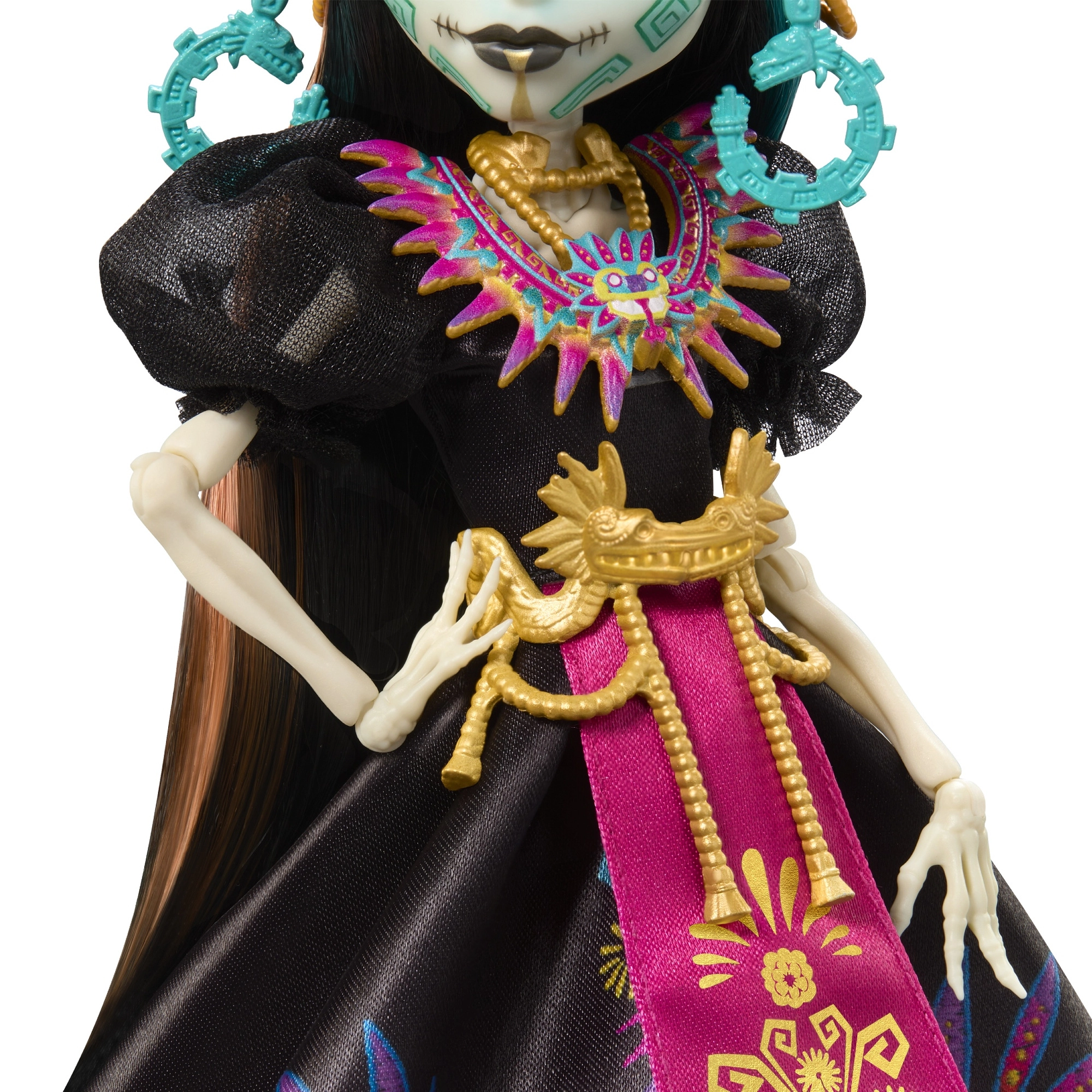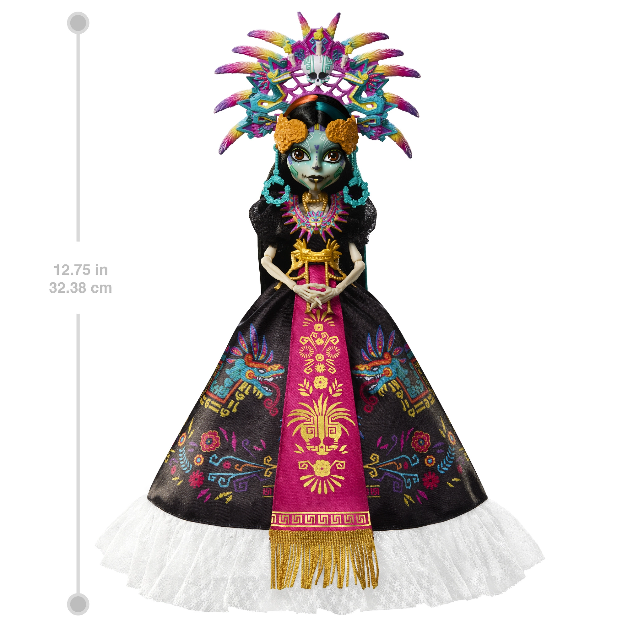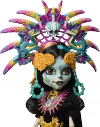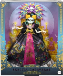 Zberateľská edícia Monster High Skullector vzdáva hold mexickému sviatku Día de Muertos. Skelita Calaveras očarí dlhými čiernymi šatami so saténovým leskom, farebnými potlačami a výraznou magentovou šerpou so zlatými strapcami. Dominantná perová čelenka, výrazné šperky a detailný face paint z nej robia výnimočný kúsok pre fanúšikov dizajnu aj kultúry.