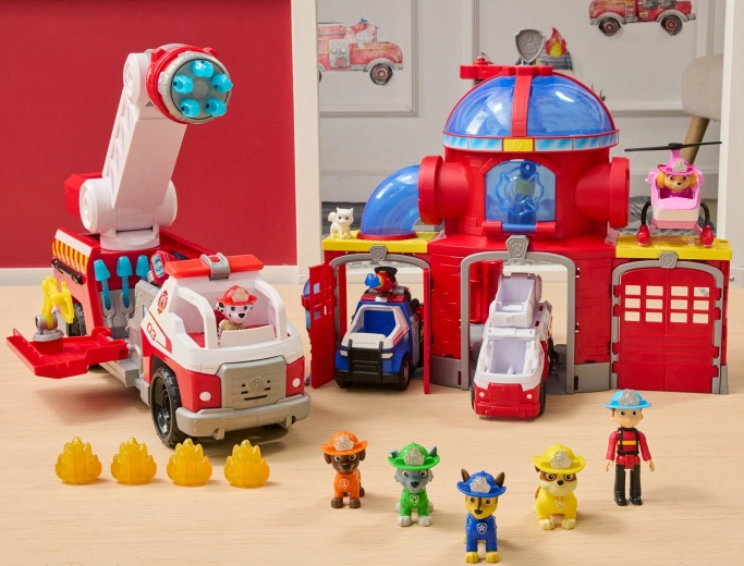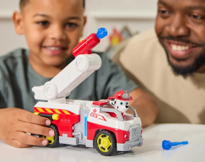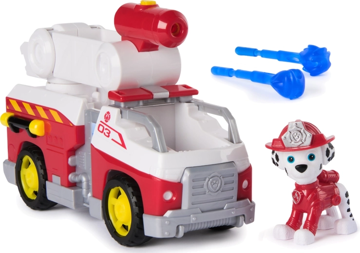 Zoznámte sa s obľúbeným dalmatínom Marshallom a jeho parádnym hasičským vozidlom inšpirovaným seriálom PAW Patrol. Deti môžu posadiť figúrku do kabíny a vyraziť k zásahu, zdvihnúť rebrík a pomocou dela vystreliť modré „vodné“ projektily na imaginárne plamene. Táto hračka podporuje fantáziu, jemnú motoriku aj tematickú hru na záchranárov.