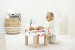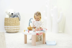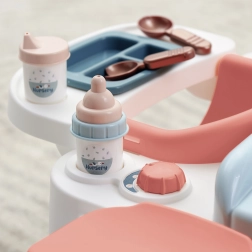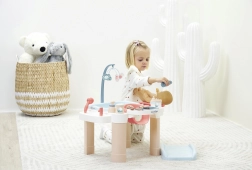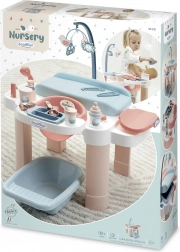 Stolík v jemných pastelových tónoch je ideálny do detskej izby. Vanička s výlevkou, organizéry na fľaštičky a náradie aj sklopné veko prebaľovacej plochy zabezpečujú prehľad a poriadok. 13 kusov príslušenstva (fľaštičky, lyžička, nádobky a i.) robí hru pútavou a realistickou.