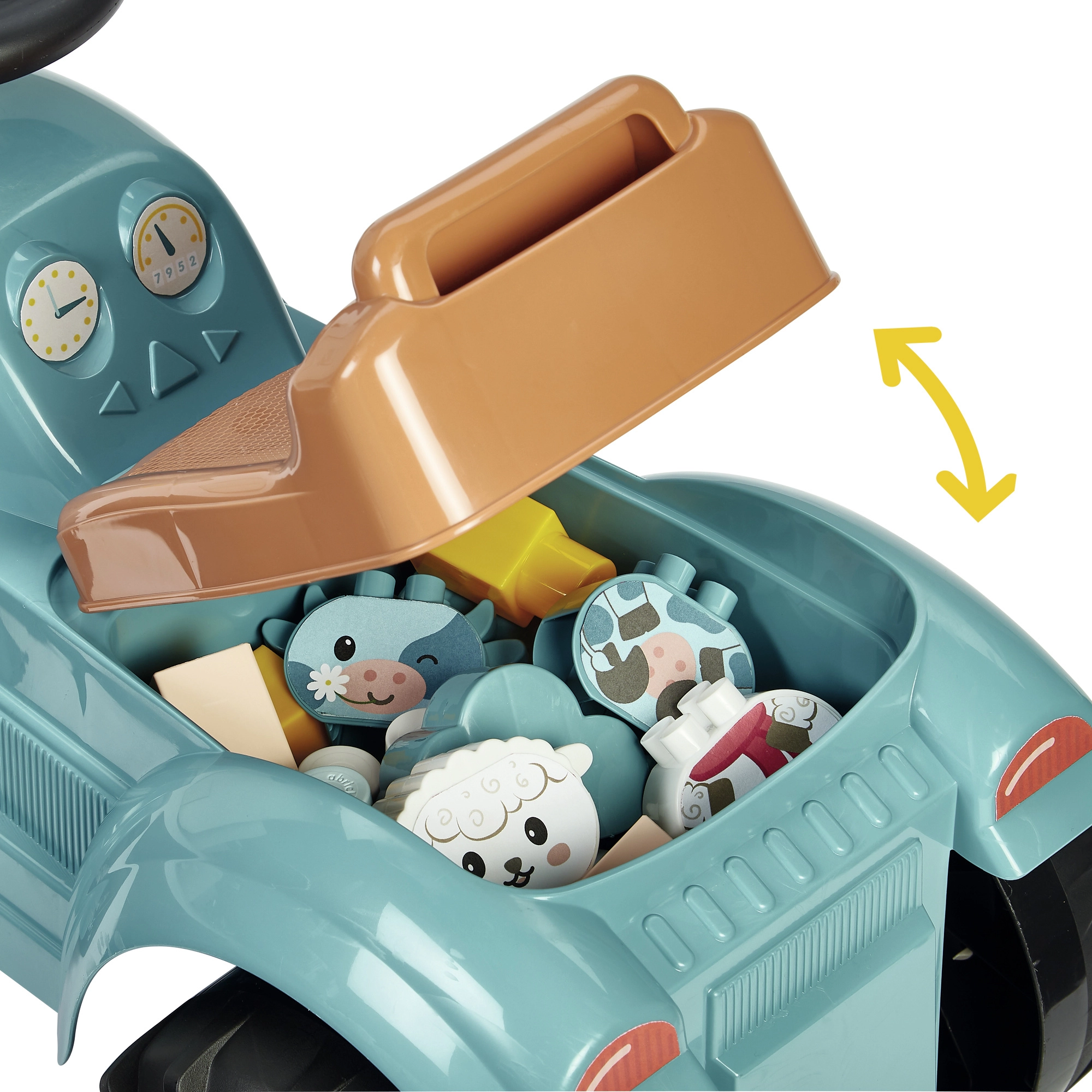 Súčasťou balenia je 15 stavebných kociek, z ktorých dieťa ľahko poskladá kravičku a ovečku, a ďalšie dieliky na kreatívne stavanie. Set podporuje rozvoj jemnej aj hrubej motoriky, koordináciu a role-play farmára. Celý vozík meria približne 86 × 32,5 cm a je ideálny pre deti 12–36 mesiacov.