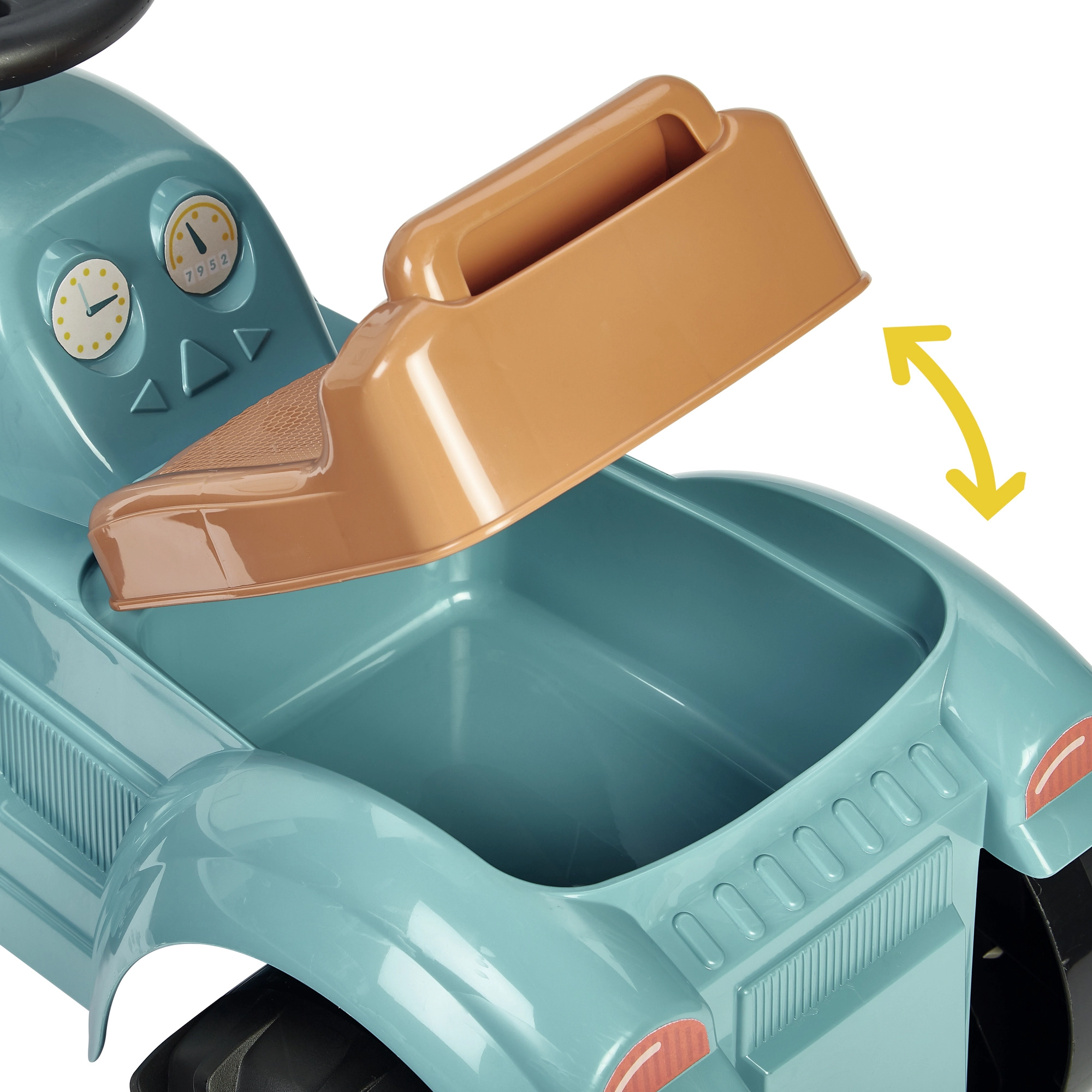 Pod výklopným sedadlom sa nachádza priestranná skrýša na obľúbené drobnosti. Deti sa odrážajú nohami, čím prirodzene posilňujú svaly a rozvíjajú koordináciu, zatiaľ čo volant umožňuje jednoduché ovládanie smeru.