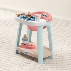 Stabilná vysoká stolička s tácom umožňuje deťom pohodlne „kŕmiť“ bábiku a napodobňovať skutočné rituály pri jedle.