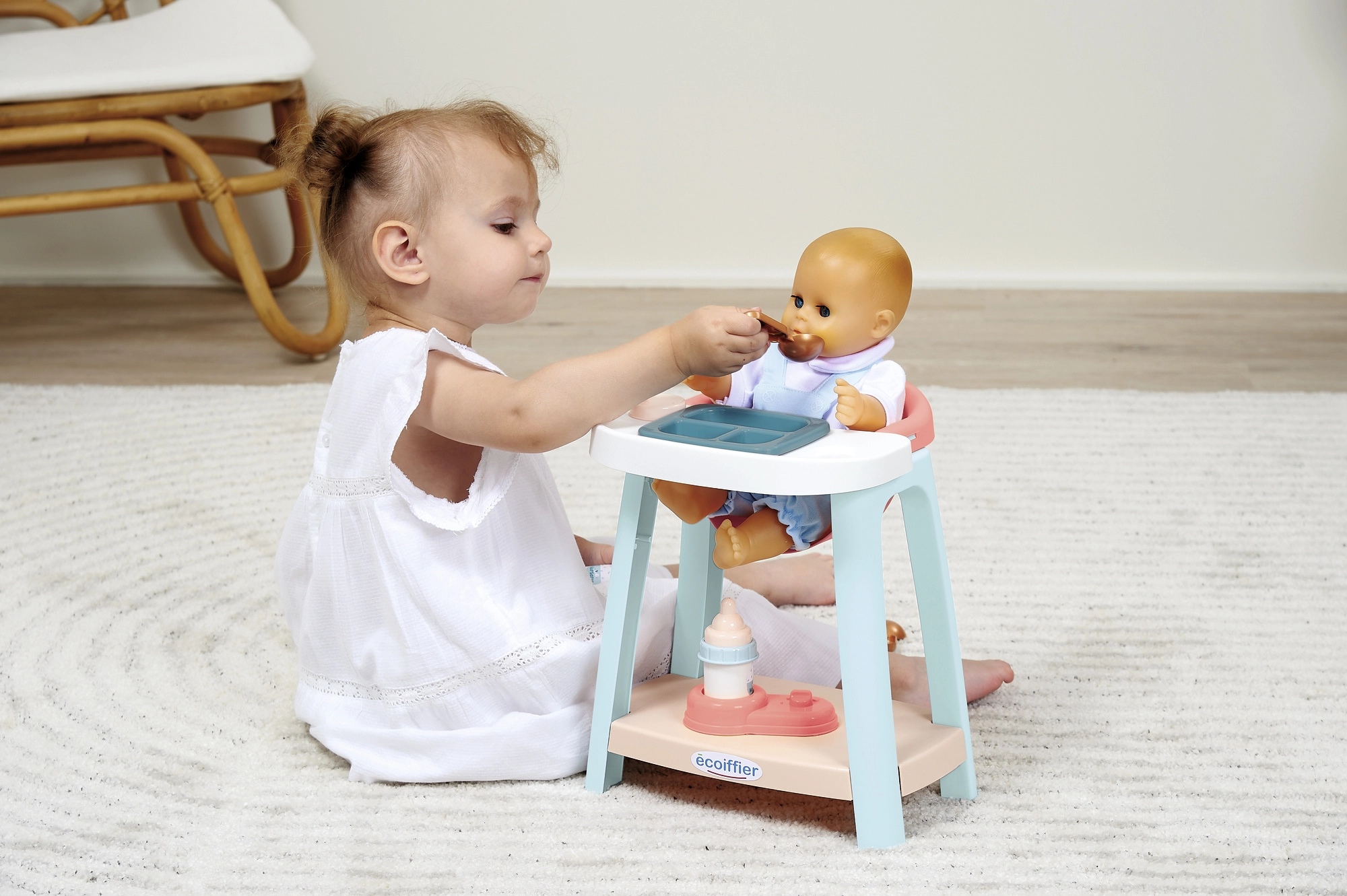Doprajte deťom realistickú hru na starostlivosť s kompaktnou sadou na kŕmenie bábik od značky ECOIFFIER. Obsahuje jedálenskú stoličku, tác s priehradkami a praktické doplnky na hranie rolí. Vďaka odolnému plastu, bezpečnému prevedeniu a pastelovým farbám je ideálna do každej detskej izby.