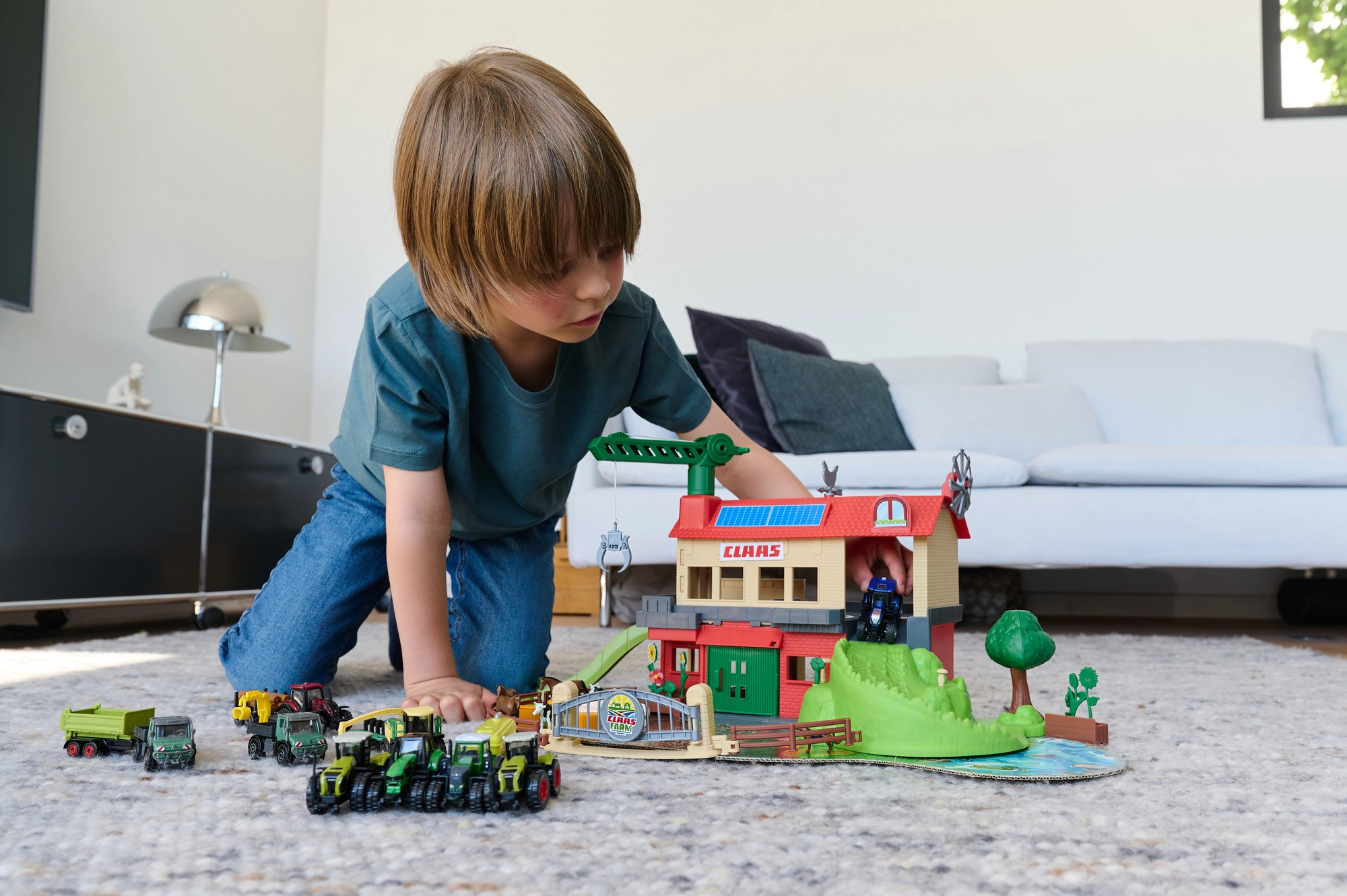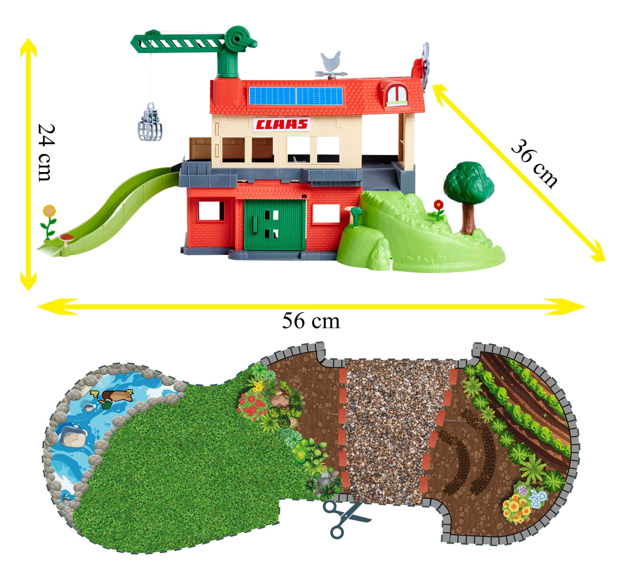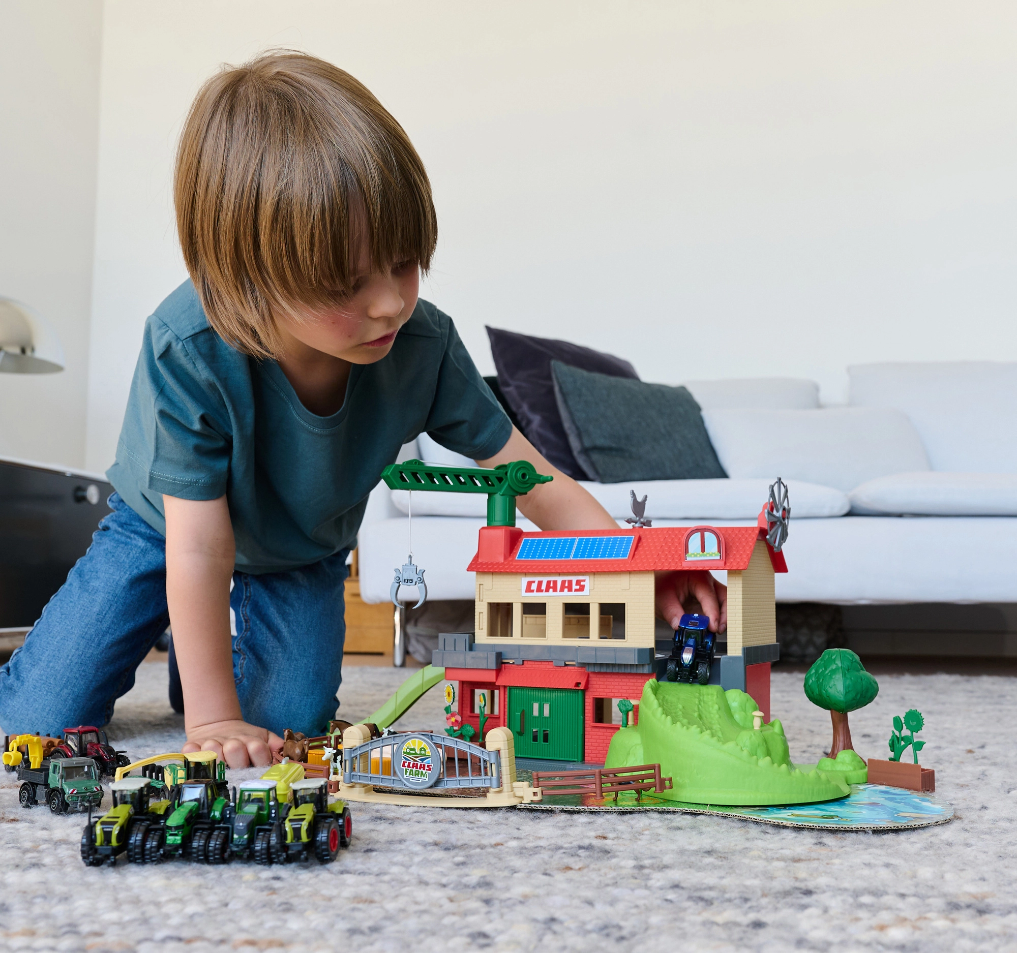 Veľká farma CLAAS prináša deťom autentický zážitok z vidieka. Dvojposchodová konštrukcia so stodolou, rampami a ohradami poskytuje dostatok priestoru pre vozidlá a zvieratá, zatiaľ čo funkčný žeriav s kladkou umožní zdvíhať balíky sena či príslušenstvo medzi úrovňami. Licencované modely CLAAS potešia realistickým vzhľadom aj hladkým chodom kolies.