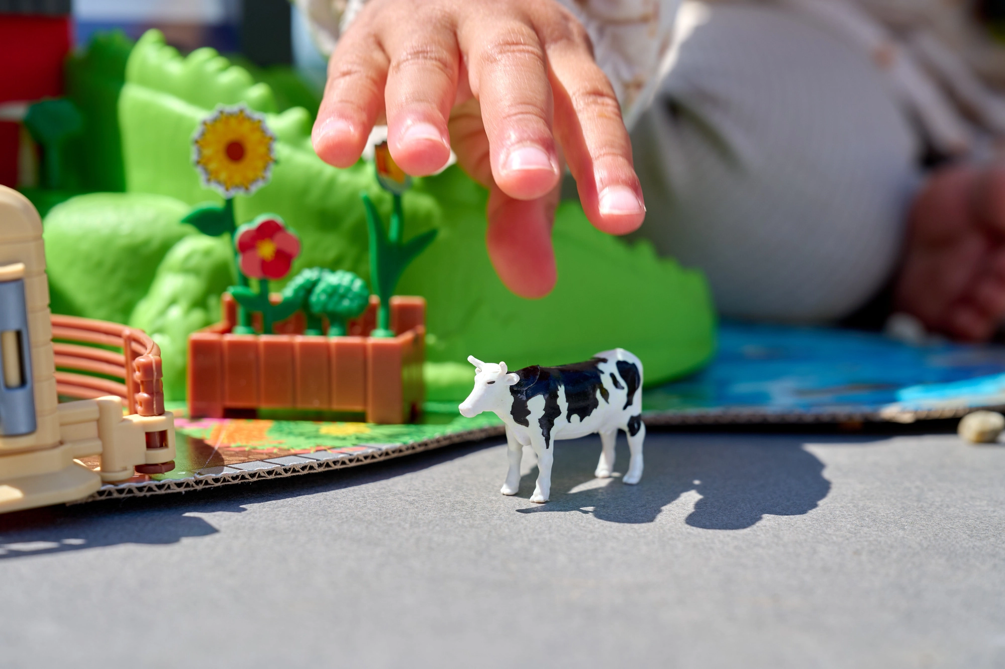 Stavajte a hrajte sa na dvoch úrovniach: dole skladujte vozidlá, hore zvieratá a seno. Rampy a brány zvyšujú variabilitu hry a podporujú predstavivosť.