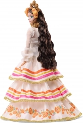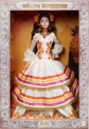 Táto zberateľská bábika BARBIE je poctou sviatku Dia de Muertos. Vyniká precízne spracovanými detailmi: vrstvenými bielymi šatami s kvetinovou výšivkou, zlatou čelenkou a výraznými šperkami, ktoré podčiarkujú slávnostný charakter. Dlhé vlnité vlasy a maľovaná tvár v štýle cukrovej lebky dodávajú bábike autentický vzhľad.