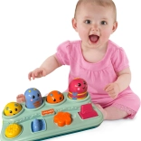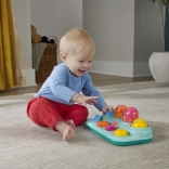 Táto interaktívna pop-up hračka s pevnou tyrkysovou základňou je navrhnutá pre malé ručičky. Štyri farebné postavičky „vyskakujú“ po stlačení tlačidla, posunutí jazdcom, otočení kolieskom alebo preklopení páčky. Deti si tak prirodzene trénujú úchop, obratnosť a koordináciu, zatiaľ čo objavujú kúzlo príčiny a následku.