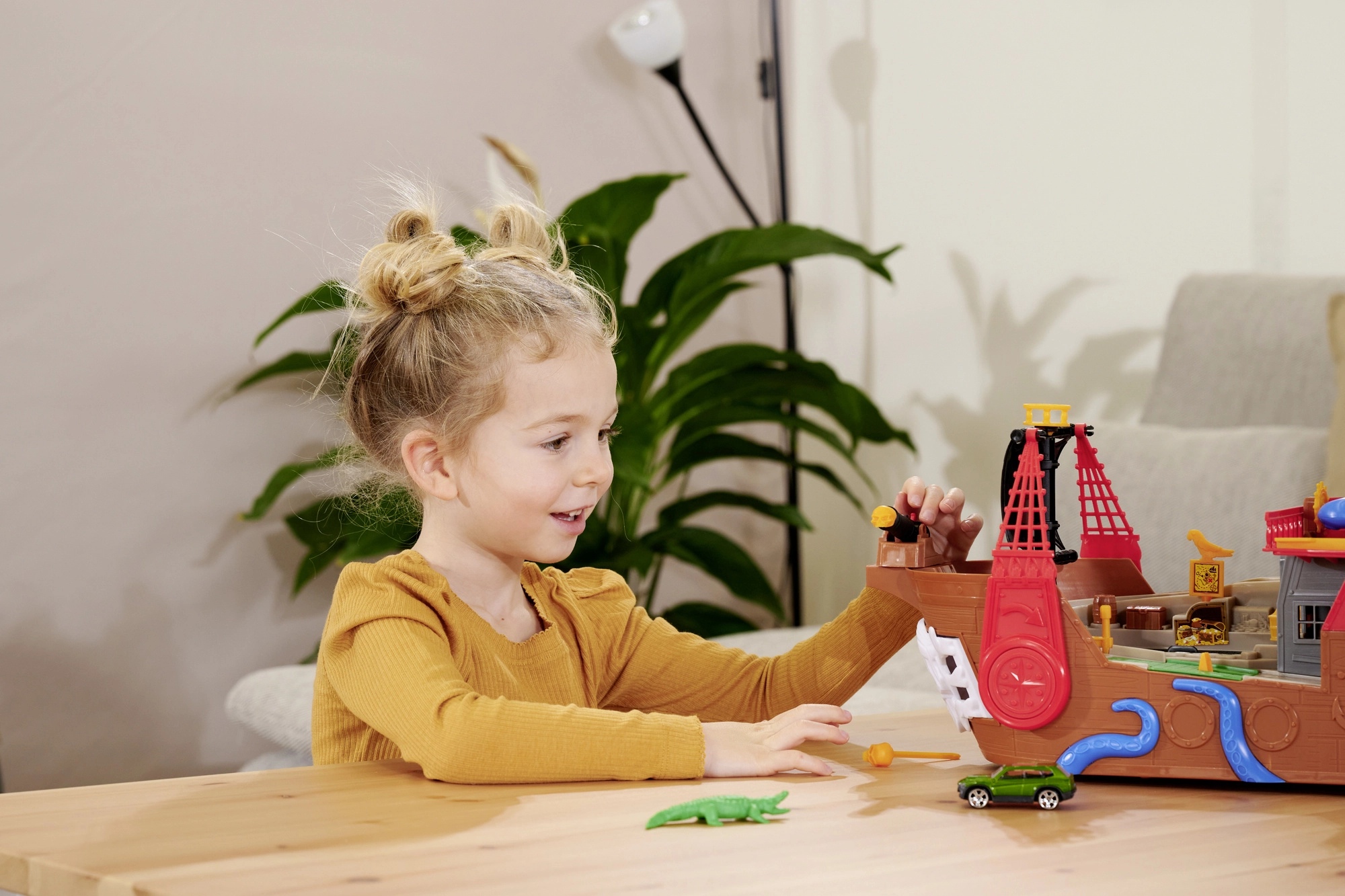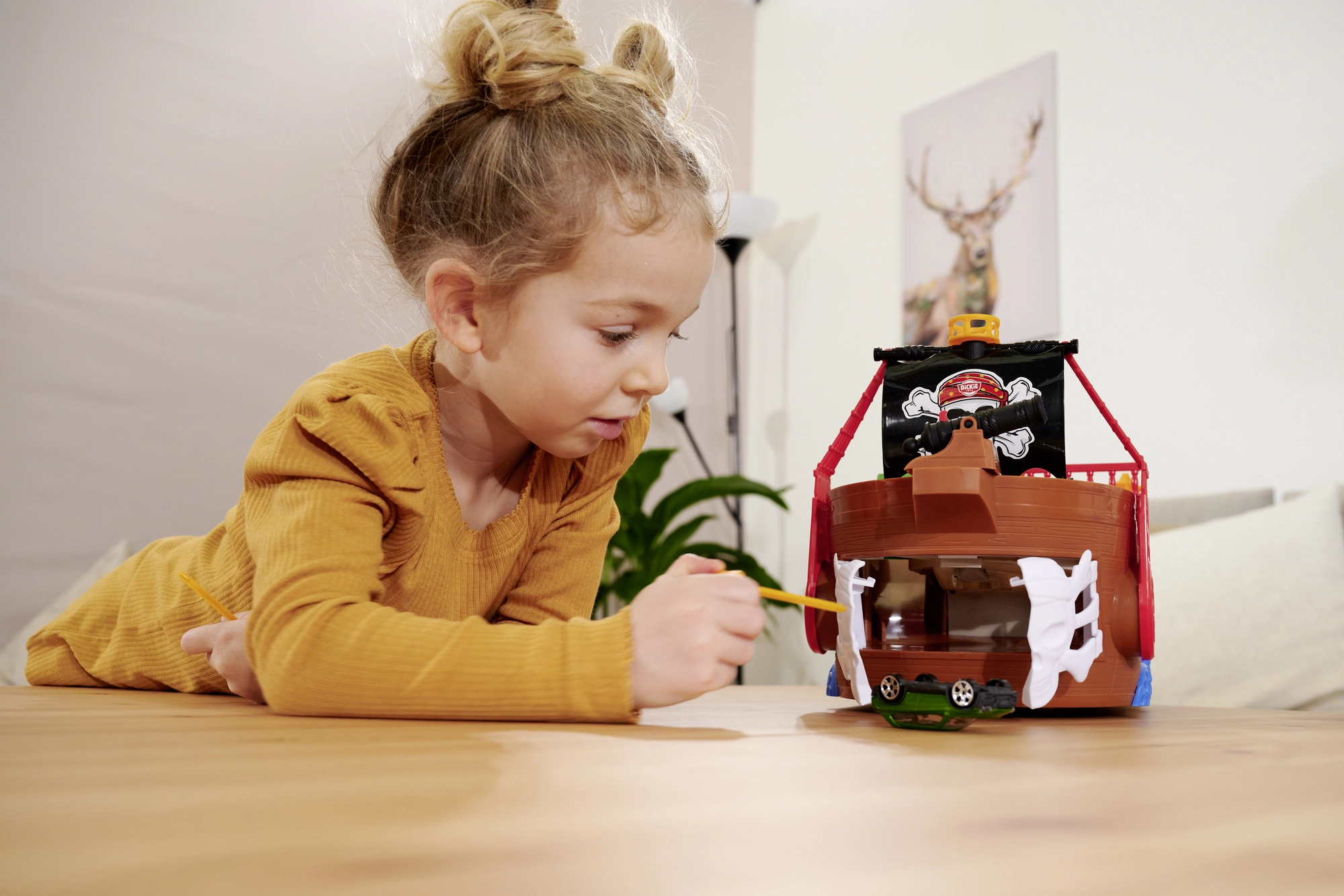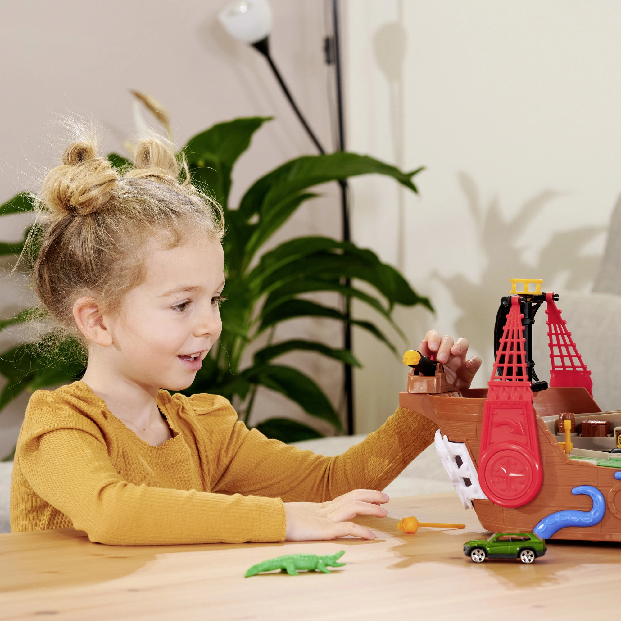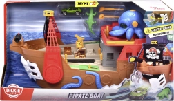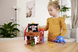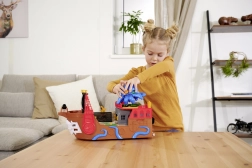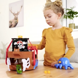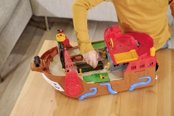 Táto detailne spracovaná pirátska loď je skutočné centrum zábavy. Po zdvihnutí paluby sa odhalí vstavaná dráha pre kovové autíčko, kde pomocou pák a prepínačov určíte, či voz preletí cez kostlivcovu bránu, skončí vo väzení, alebo bude katapultovaný z raftu. Nechýba funkčné delo, truhlica s pokladom, sudy, krokodíl a ďalšie doplnky, ktoré podporujú fantazijnú hru.