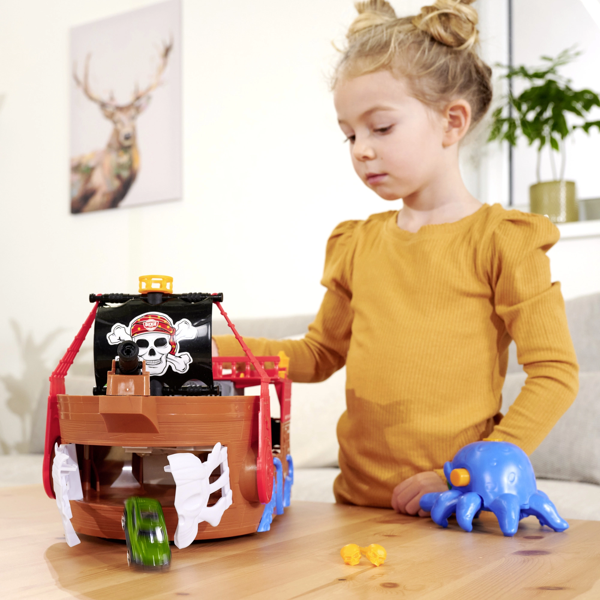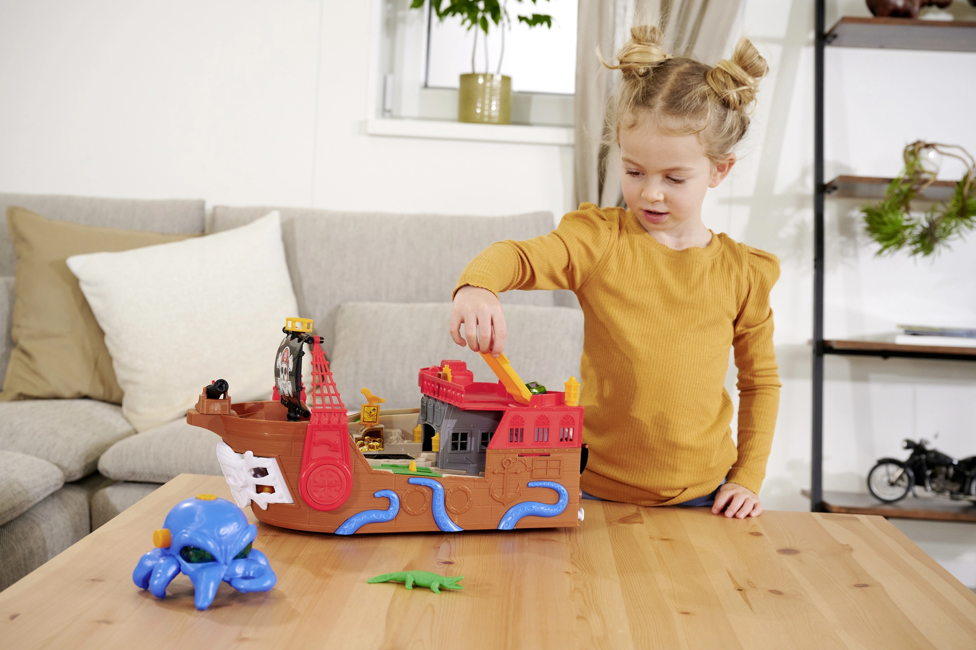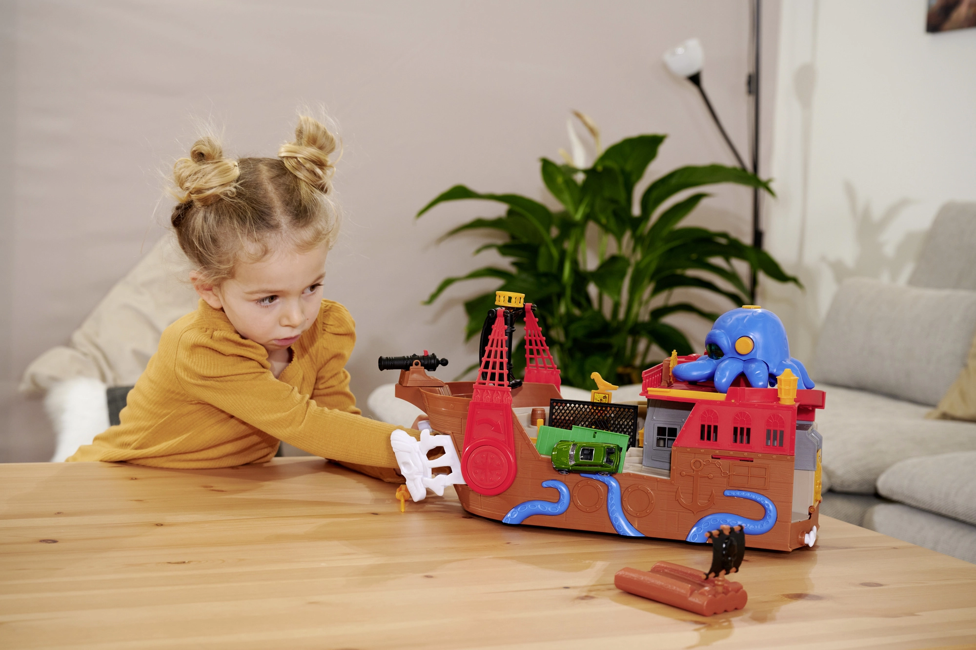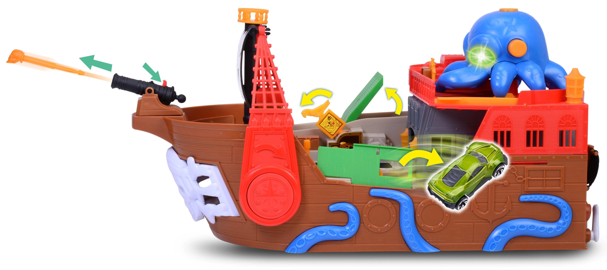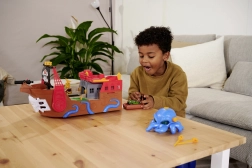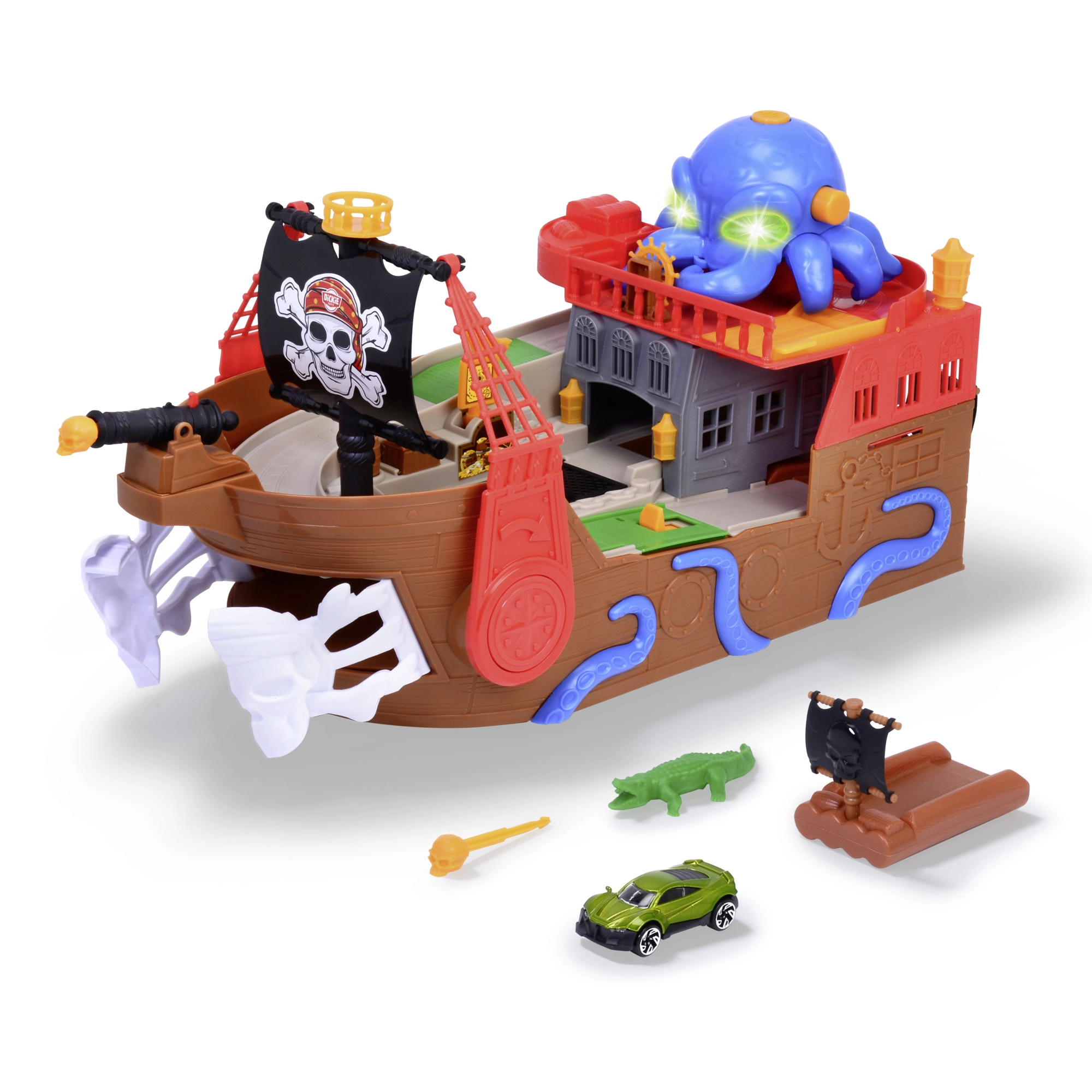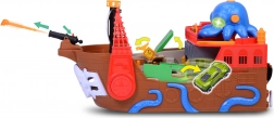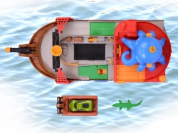 Odpojiteľná chobotnica so svetelnými a zvukovými efektmi rozsvieti oči a svojimi chápadlami „polapí“ autíčko či iné dieliky – ideálna pre dramatické pirátske príbehy. Loď aj raft sa udržujú na vode, takže sú perfektné do vane, bazéna či brodítka. Po kúpaní pokračuje akcia na koberci vďaka interaktívnym funkciám a plynulej jazde autíčka.