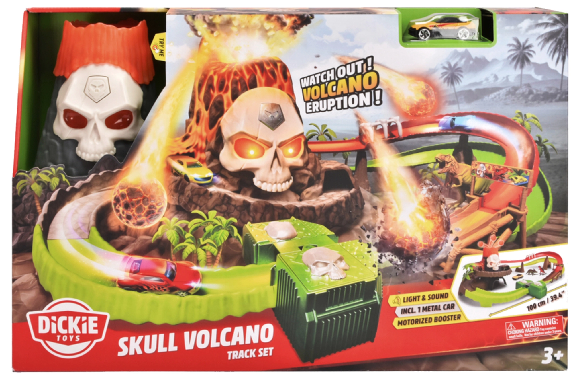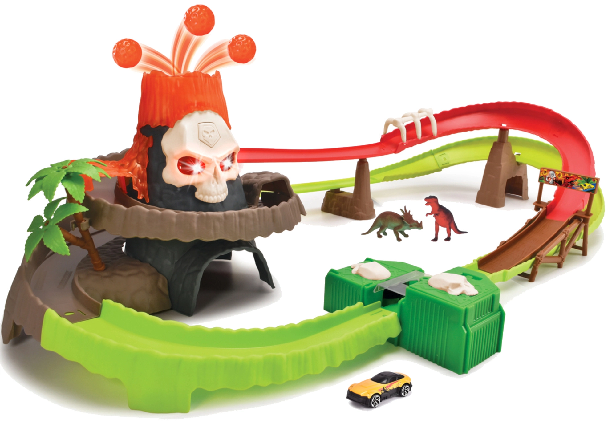 Akčný set „Lebkový vulkán“ prináša napätie pri každom prejazde. Kovové autíčko v mierke 1:64 prešvihne jaskyňou, aktivuje erupciu vulkánu a prechádza špirálovitými úsekmi plnými prekážok. O atmosféru sa starajú svietiace oči lebky a zvukové efekty, ktoré sa spustia stlačením strieborného tlačidla.