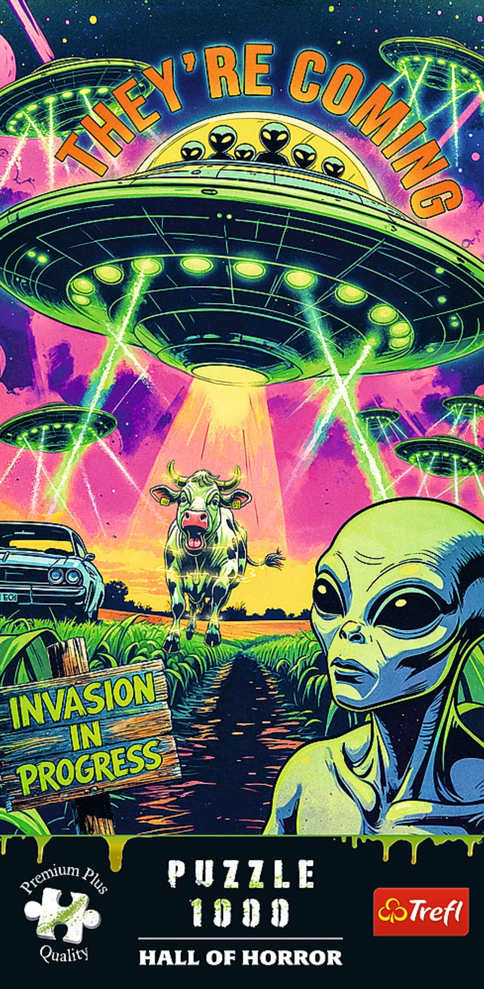 Vstúpte do sveta napätia a sci‑fi s kolekciou Hall of Horror. Táto skladačka s inváziou mimozemšťanov ponúka intenzívny vizuálny zážitok a zároveň upokojujúci relax pri skladaní. Vďaka najhrubšej lepenkovej doske a unikátnym tvarom dielikov je skladanie plynulé a výsledný obraz ostrý a stabilný.