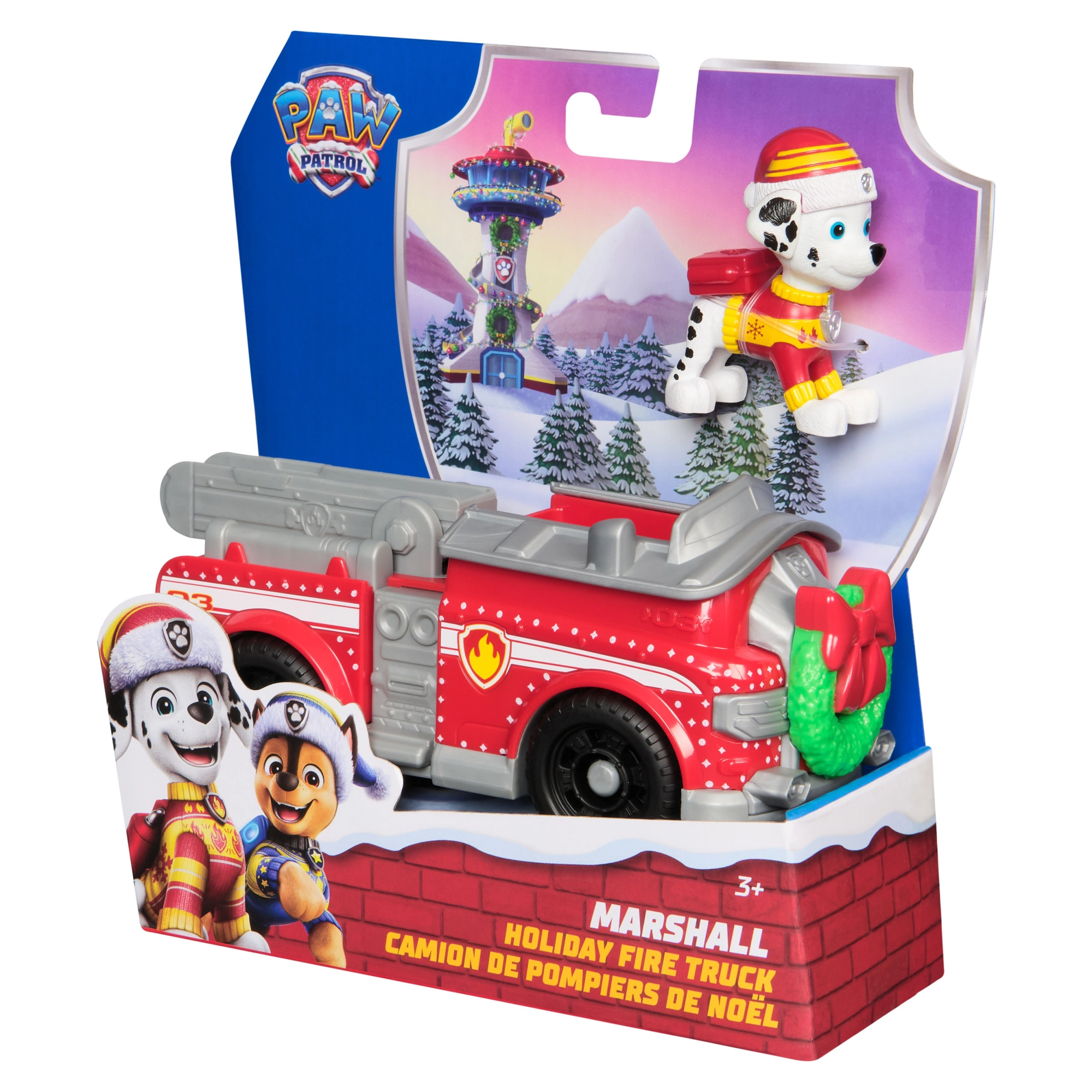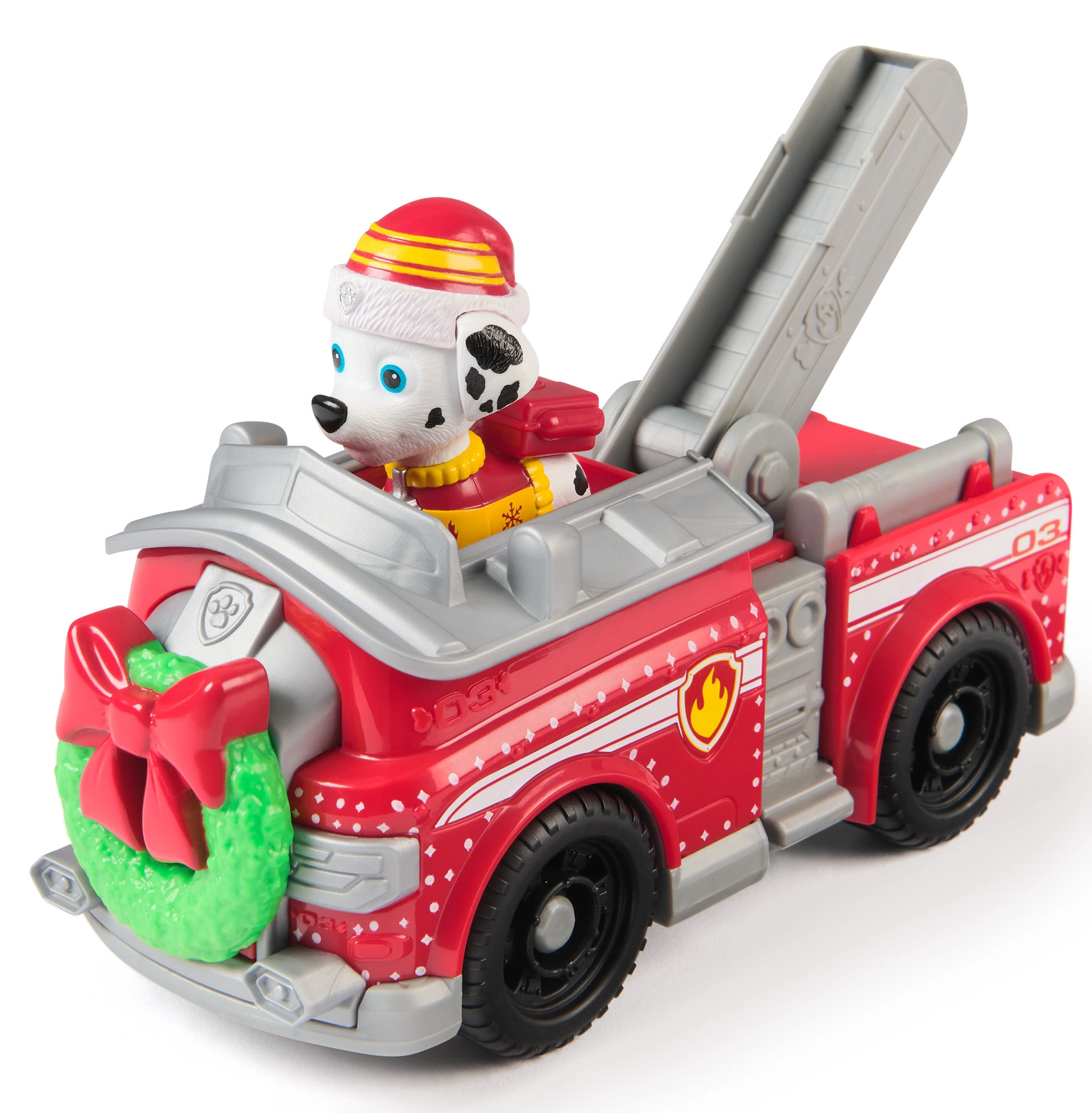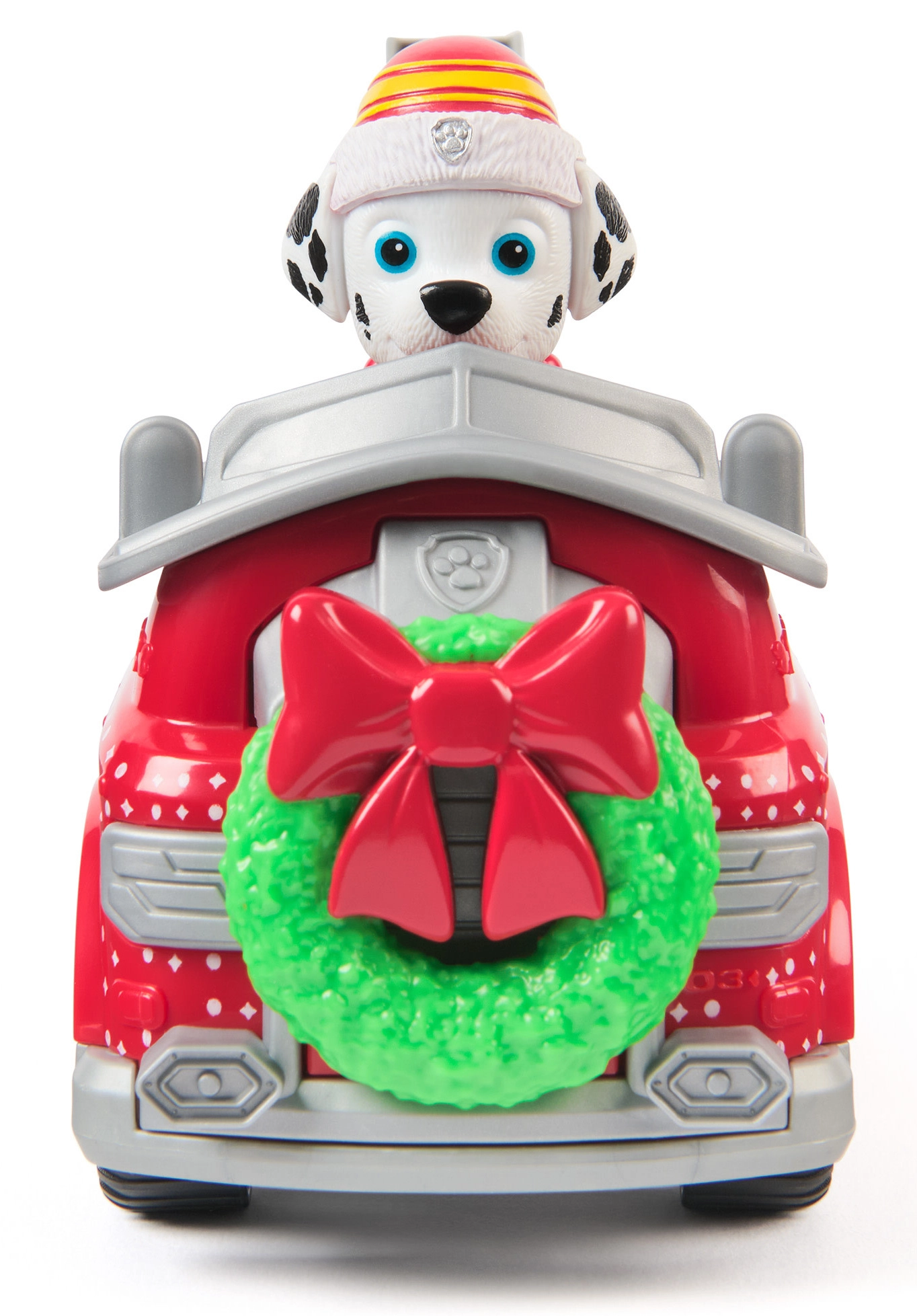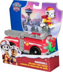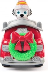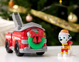 Červené hasičské auto zdobí zelený veniec s mašľou a zimné motívy. Marshall v teplej čiapke pripraví každú misiu na zimu.
