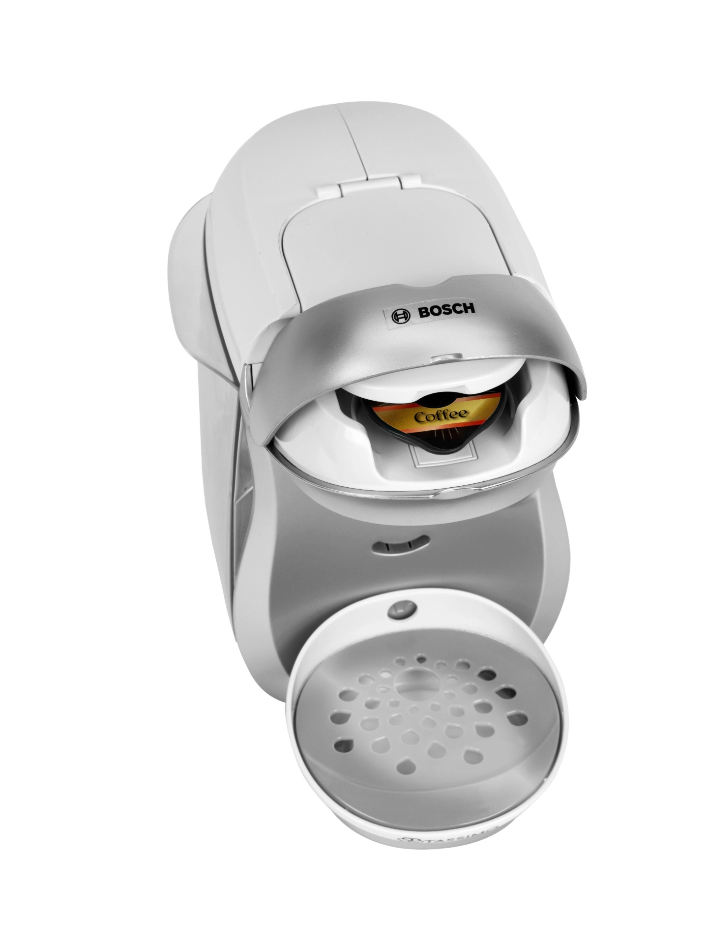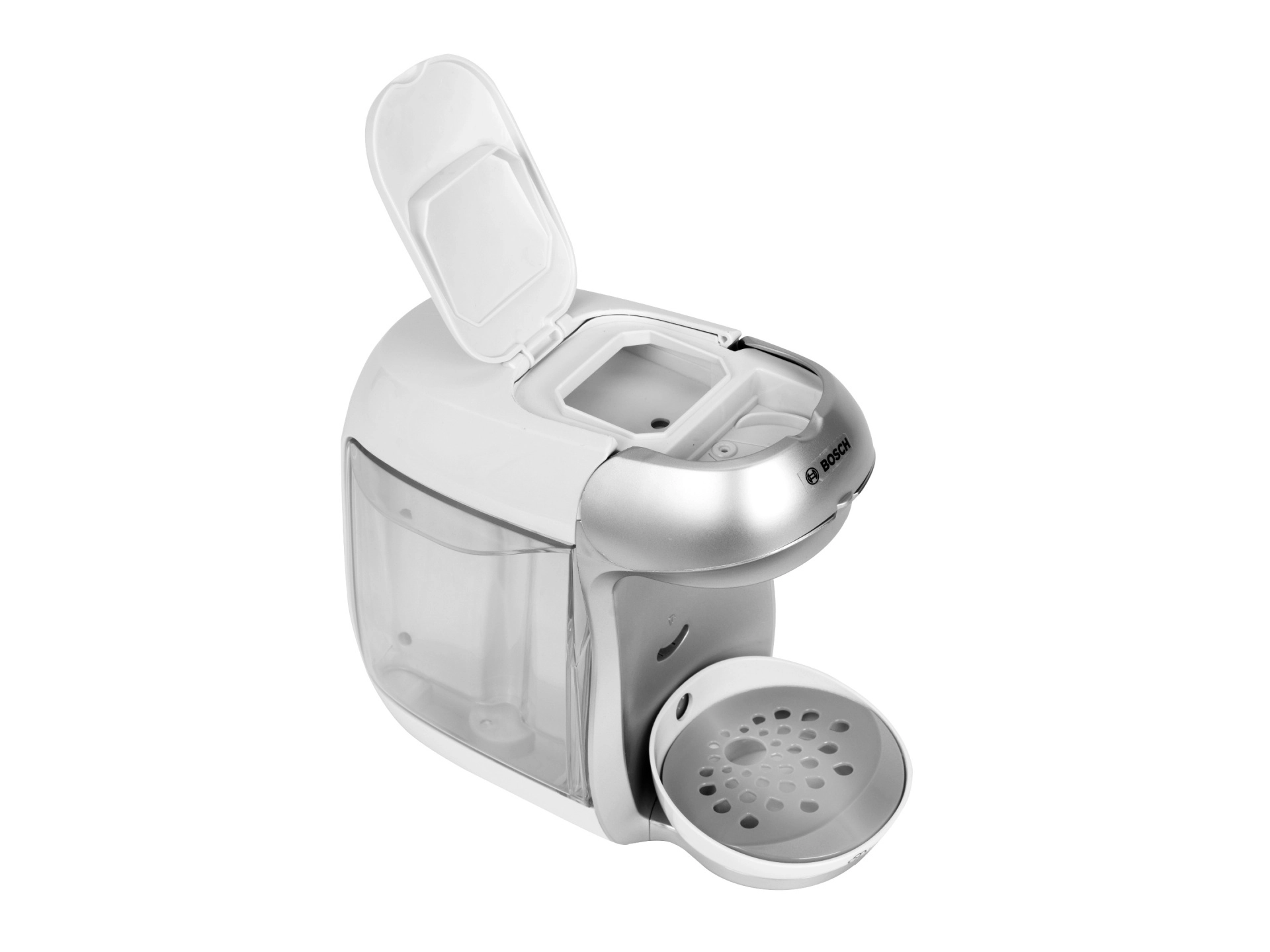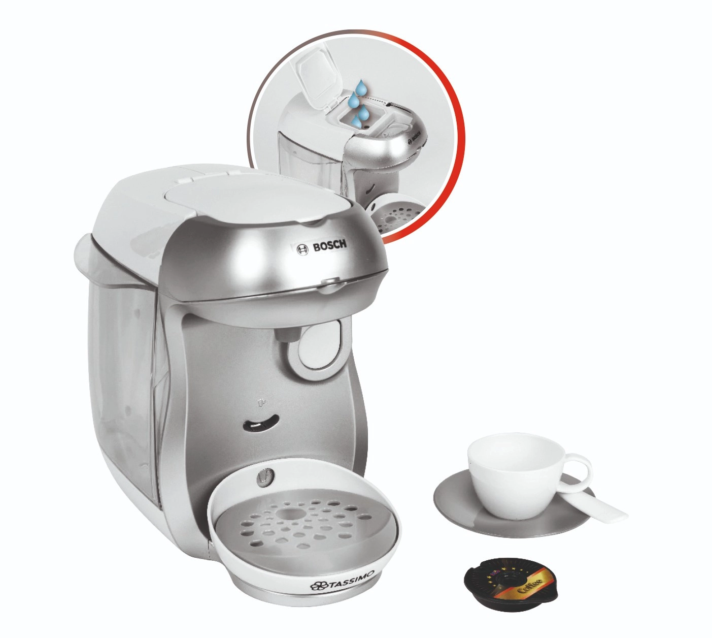Detský kávovar TASSIMO BOSCH v bielo-striebornom prevedení verne napodobňuje skutočné zariadenie, no je plne bezpečný pre deti. Stačí naliať vodu do nádržky, vložiť kapsulu pod horné veko a stlačiť veľké tlačidlo start/stop – kávovar spustí prietok vody a pridá autentické zvuky pre ešte realistickejší zážitok z hry.