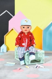 Štýlový outfit pre bábiky BABY born veľkosti 36 cm s motorkárskym nádychom: červená bunda v koženom vzhľade s potlačou medvedíka, sivo‑modré nohavice, modré tenisky a šiltovka s kačičkou Bertou. Strih easy fit pre ľahké prezliekanie, súčasťou je ramienko.