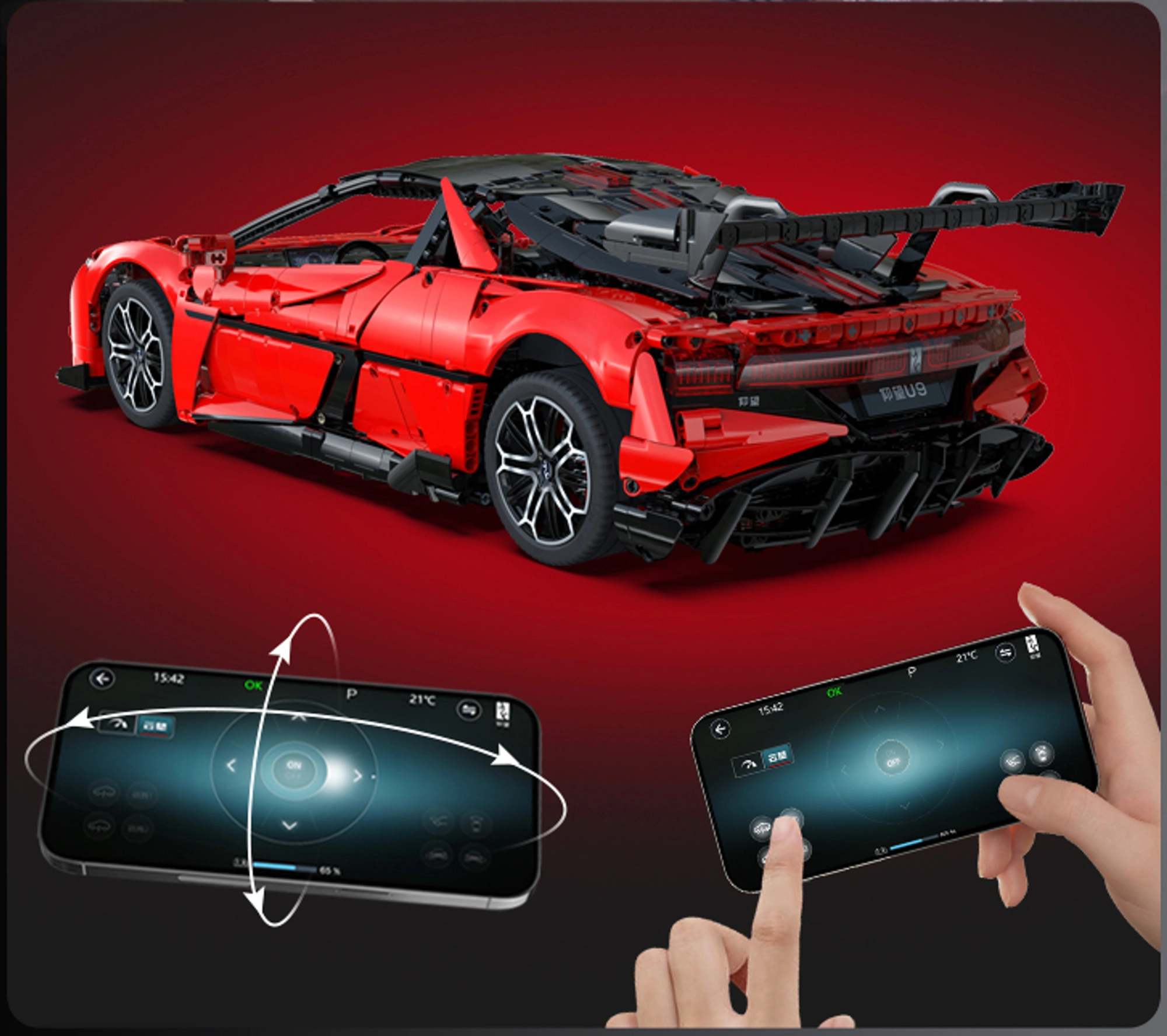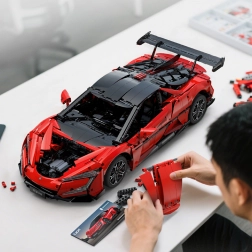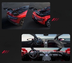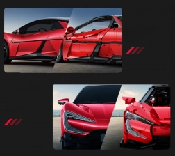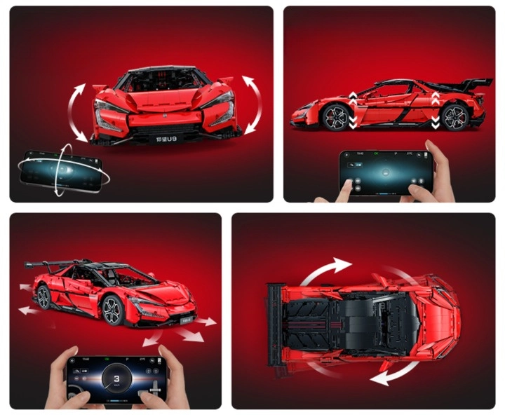 Zažite kombináciu precízneho stavania a inteligentnej zábavy. Tento oficiálne licencovaný model BYD YANGWANG U9 v mierke 1:8 meria po zložení približne 60,5 × 29,5 × 16 cm a verne zachytáva aerodynamické línie, červenú karosériu s tlačenými detailmi aj športový podvozok. Vďaka ovládaniu cez Bluetooth aplikáciu sa model rozbehne až na 3,8 km/h a zvláda jazdu vpred/vzad aj zatáčanie.