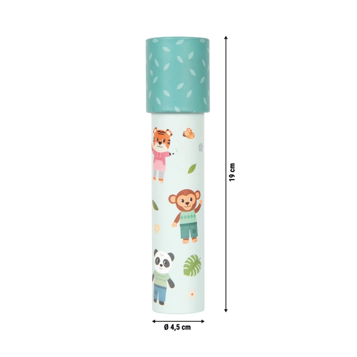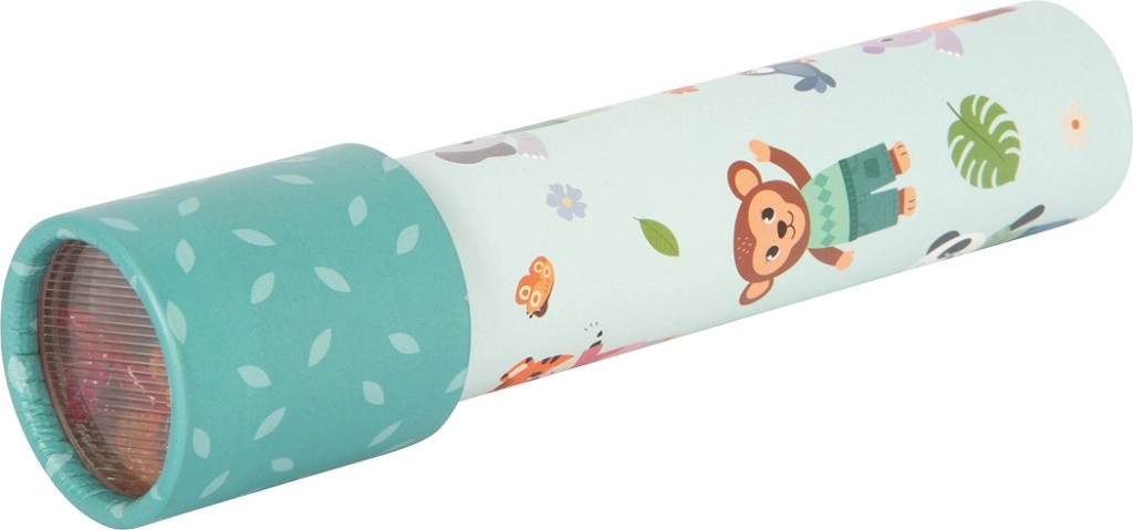 Kaleidoskop Priatelia z džungle SMALL FOOT poteší deti od 3 rokov hravým dizajnom s motívmi tigra, slona, opice, zebry, pandy a hrocha. Pri každom otočení sa vo vnútri rozžiaria stále nové geometrické obrazce, ktoré podnecujú fantáziu a učia deti rozpoznávať farby a tvary.