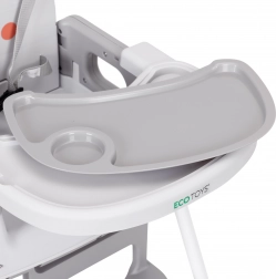 O bezpečie sa stará 5-bodový pás, medzinožná bezpečnostná zarážka proti skĺznutiu a protišmykové nožičky. Široká dvojitá tácka so zvýšenými okrajmi a držiakom na pohár sa dá nastaviť a hornú vrstvu ľahko zložiť a umyť v umývačke. Opierka nôh a ergonomické sedadlo zabezpečujú správne sedenie a komfort pri jedle aj hraní.