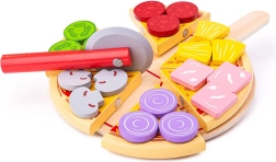 Šesť plátkov pizze so spojmi na suchý zips drží pokope a dá sa „ukrojiť“ dreveným krájačom. Deti si vyskúšajú realistické krájanie a servírovanie.