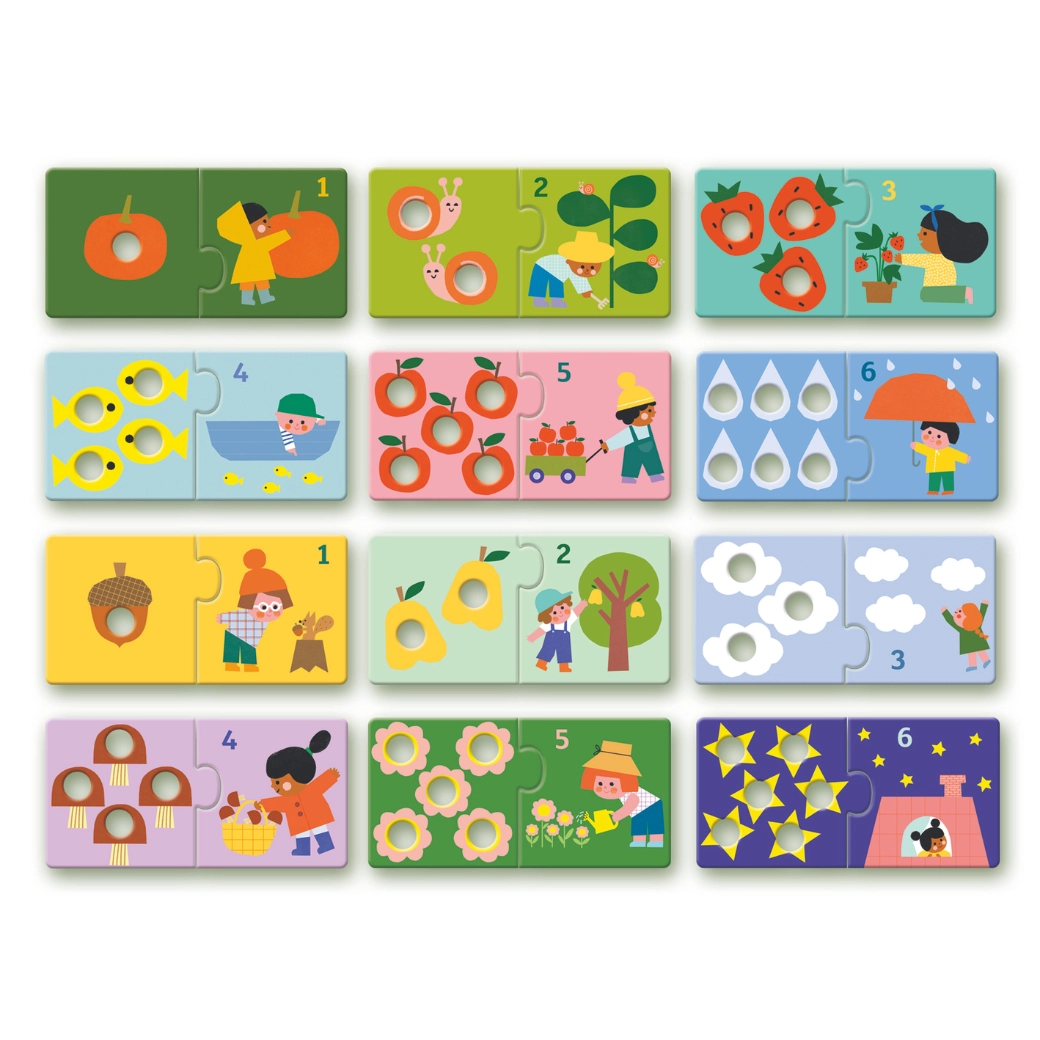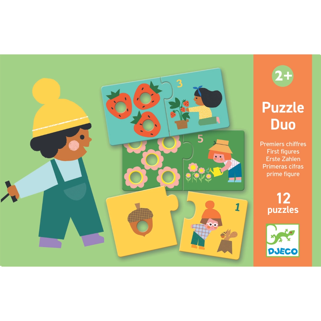 Djeco Duo Puzzle Prvé čísla je vzdelávacia sada, v ktorej deti párujú obrázky s odpovedajúcou číslicou. Vďaka jednoduchým a farebným ilustráciám deti rýchlo pochopia vzťah medzi počtom predmetov a číslom, ktoré ho označuje. Skvelá voľba pre predškolákov a prvé krôčiky do sveta čísel.