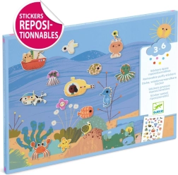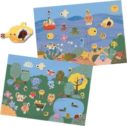 Táto kreatívna sada ponúka dve ilustrované pozadia – podmorský svet a les s jazierkom – a arch roztomilých samolepiek s rybkami, krabom, ponorkou, loďkou, lesnými zvieratkami a ďalšími motívmi. Deti môžu samolepky ľubovoľne premiestňovať a vymýšľať stále nové príbehy.