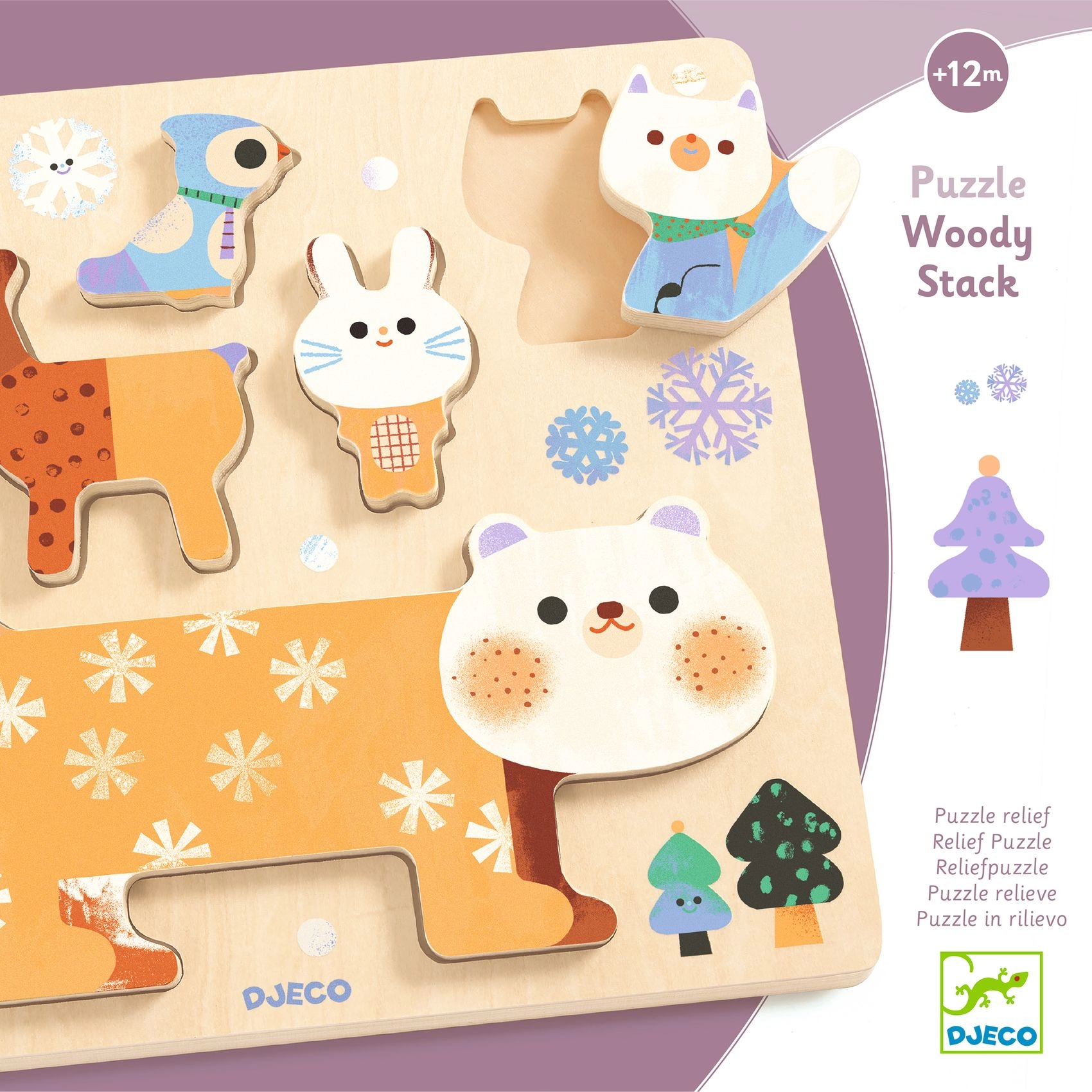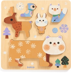 Táto sada kombinuje klasické vkladacie drevené puzzle s balančnou vežou. Zábavné zvieratká – medveď, zajac, vtáčik, srnka a sova – možno vkladať do dosky podľa tvaru alebo z nich stavať vežu a skúšať rovnováhu. Hra pomáha deťom rozvíjať trpezlivosť a priestorové vnímanie.