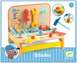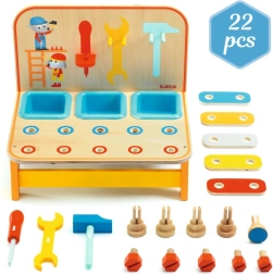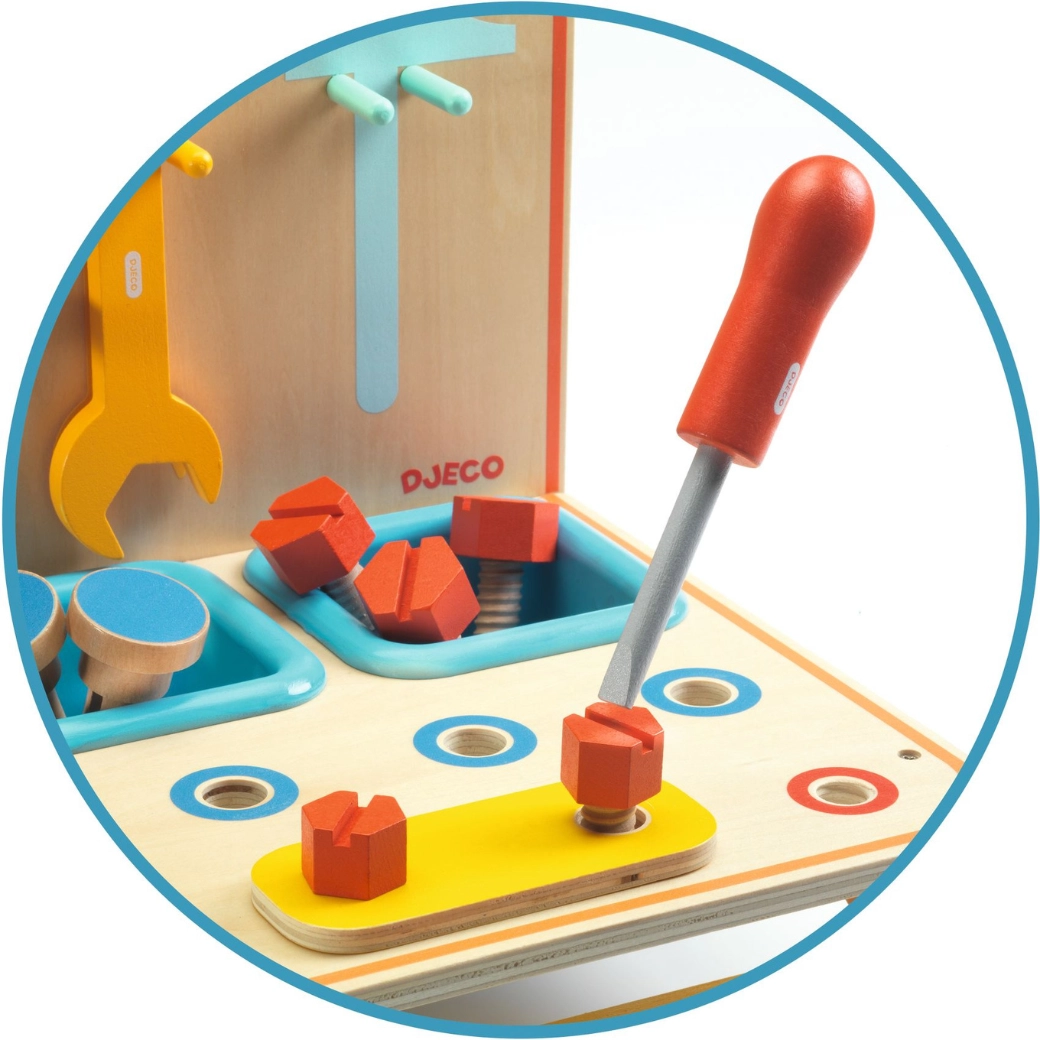 Kompaktná drevená mini dielňa od DJeco poteší všetkých malých opravárov. Ponúka bohatú sadu náradia, farebné skrutky a dieliky na montovanie, vďaka ktorým deti rozvíjajú jemnú motoriku, koordináciu oko–ruka aj kreativitu pri hre.