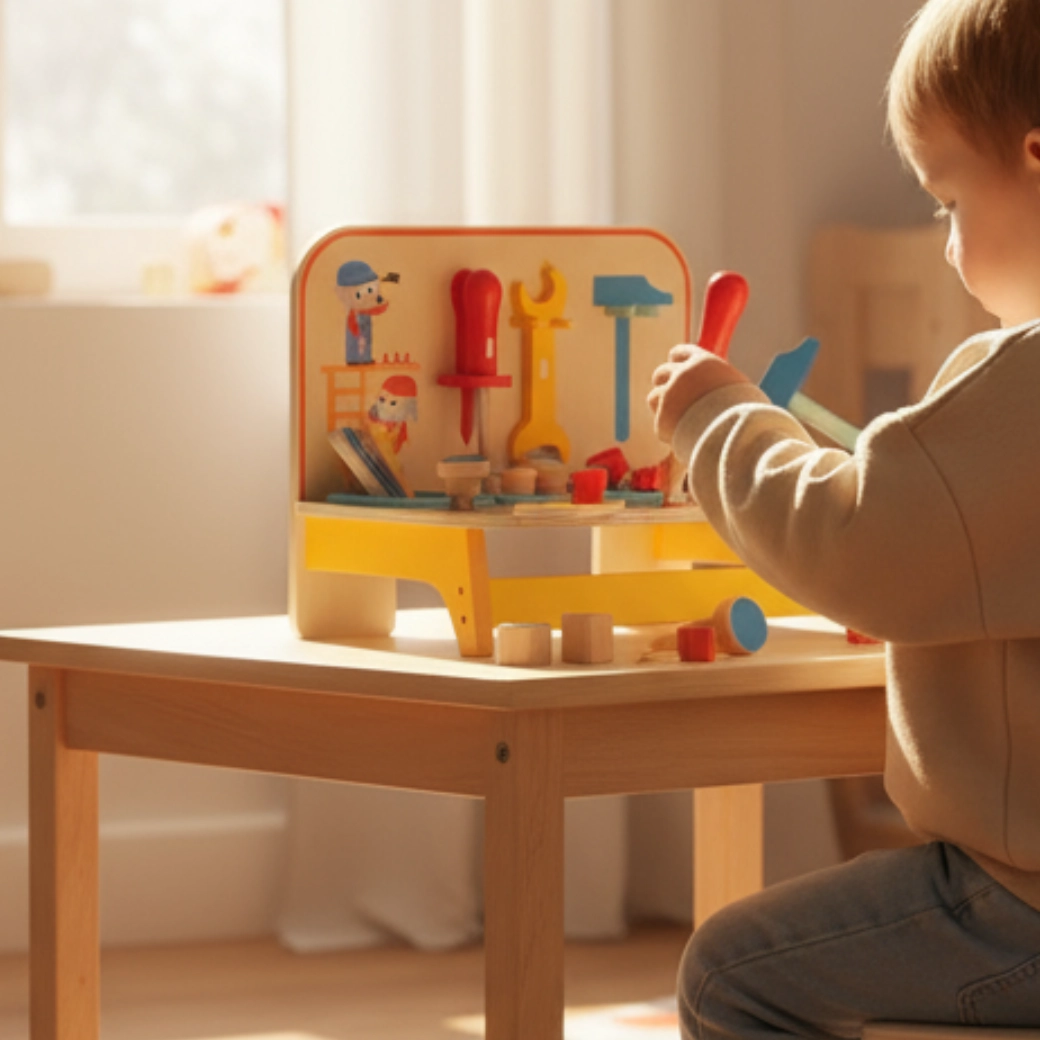Robustné spracovanie so zaoblenými hranami a sýté farby podporujú bezpečnú a lákavú hru. Integrované priehradky pomáhajú udržať poriadok a naučia deti organizácii náradia. Ideálne ako darček pre malých kutilov, ktorí milujú kreatívnu a zmysluplnú hru.