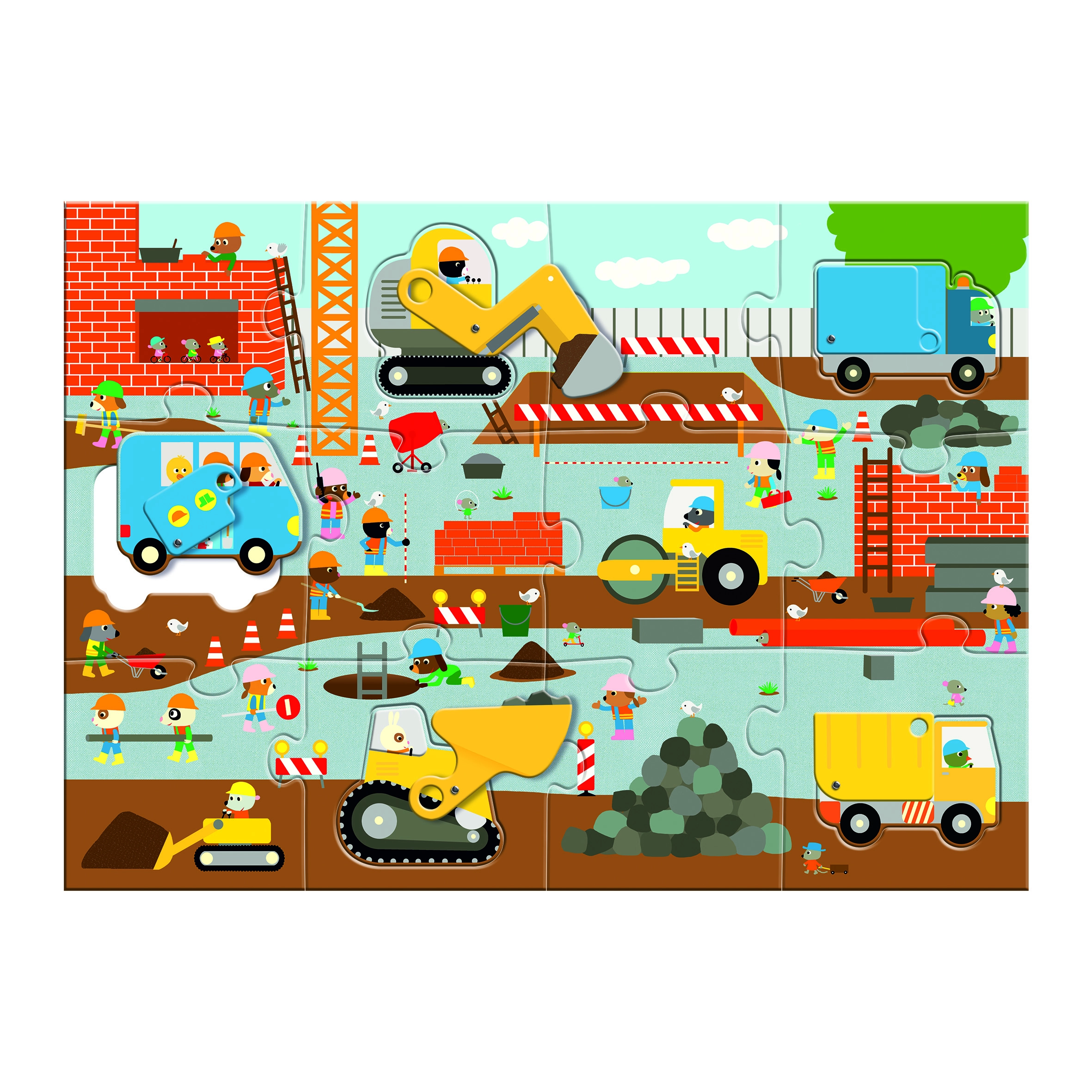 Interaktívne puzzle Stavba od Djeco spája skladanie a hru v jednom. Po zložení obrázka môžu deti „oživiť“ scénu so staveniskom vďaka pohyblivým prvkom na vybraných dielikoch – bager naloží zeminu, nákladné auto ju odvezie a práca sa môže začať. Veľké a pevné dieliky sa ľahko uchopujú a sú vhodné pre malé detské ruky.