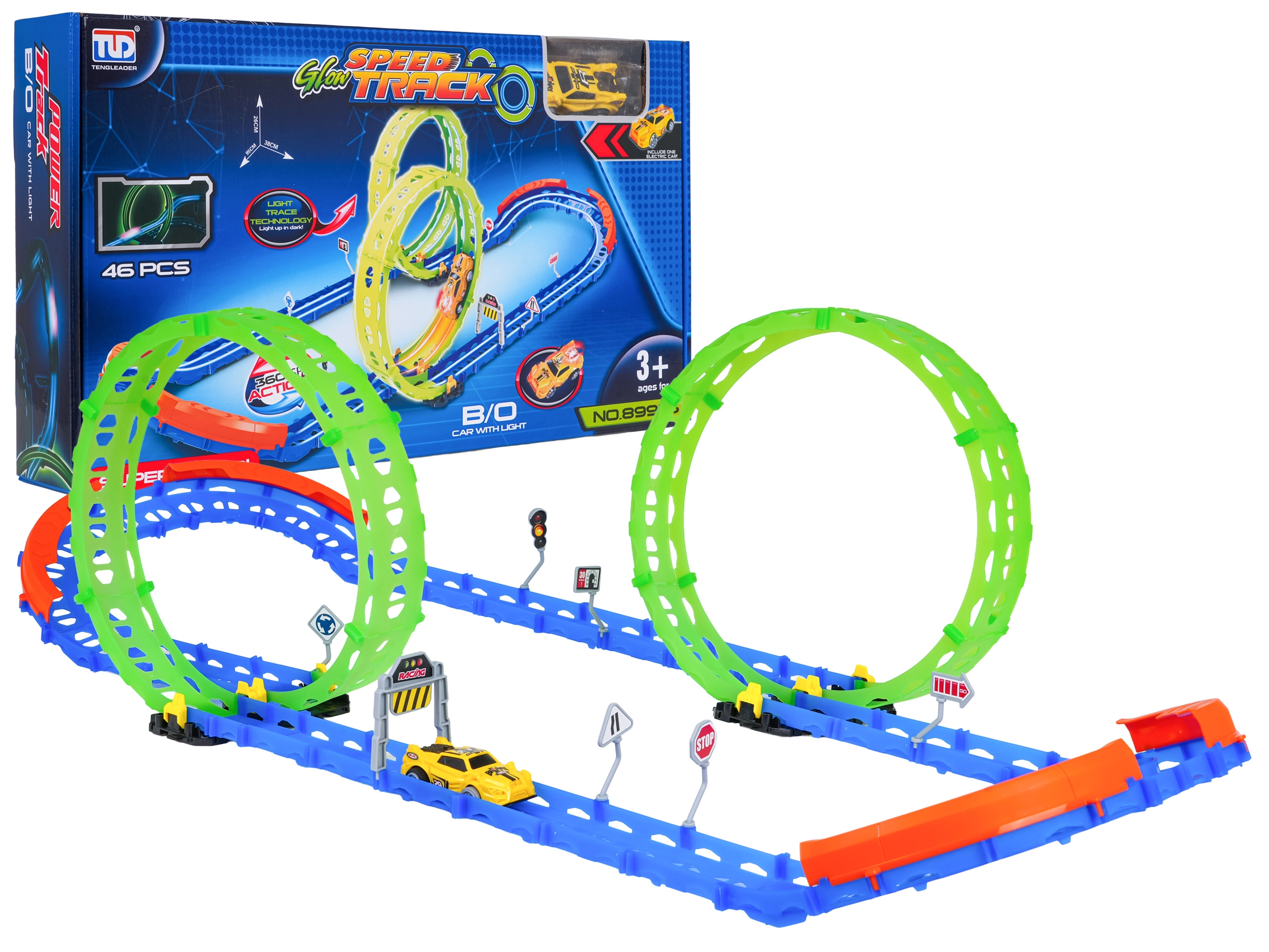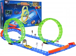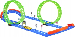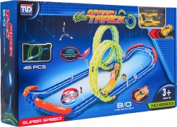 Táto fluorescenčná závodná dráha je ideálna pre deti od 3 rokov. Vďaka dvom veľkým slučkám a pevným bočným zábranám autíčko bezpečne prechádza aj ostrými oblúkmi. Svetielkujúce prvky rozžiaria jazdu v prítmí a premenia izbu na malý závodný okruh.
