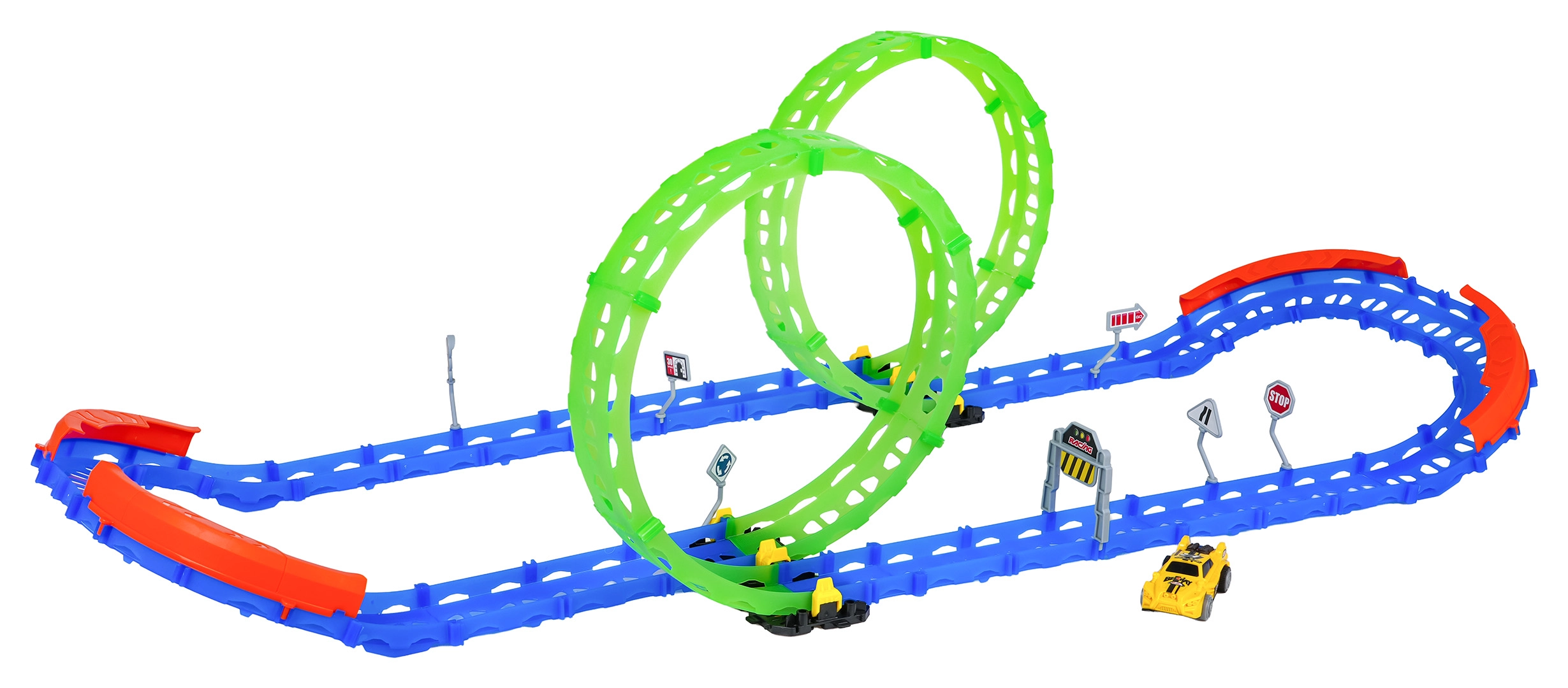 Set obsahuje 46 dielov na jednoduché zostavenie, žlté závodné autíčko s funkčným zadným osvetlením (napájanie 2× AAA, nie sú súčasťou) a cestné značenie pre ešte realistickejšiu hru. Deti si môžu trať opakovane rekonfigurovať a skúšať nové rekordy.