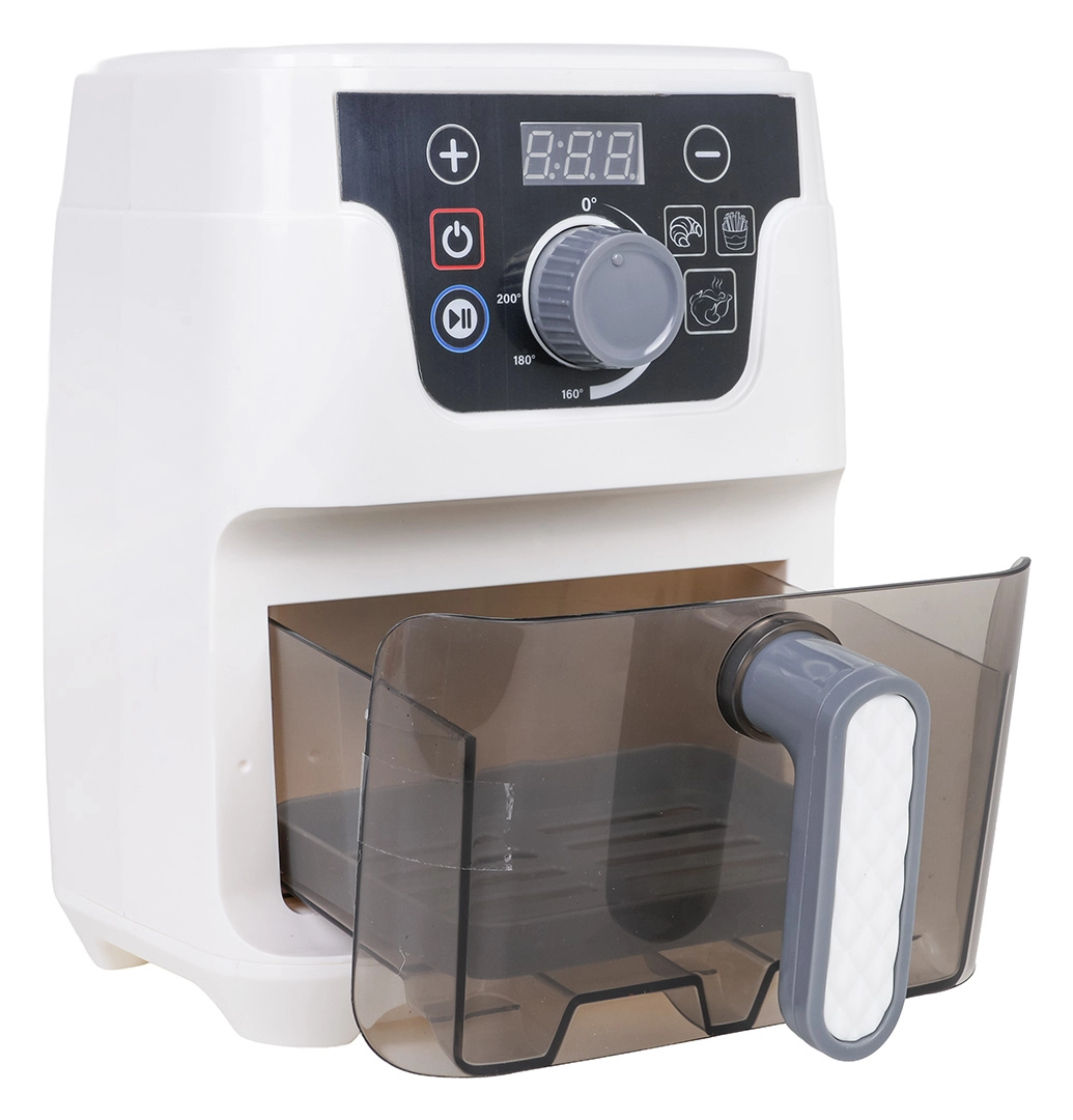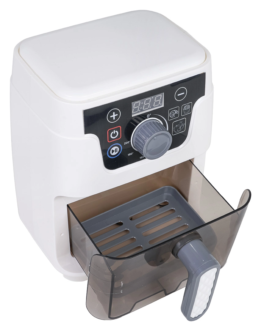 Tento detailne spracovaný detský airfryer vyzerá a správa sa ako skutočné zariadenie: má podsvietený kôš, digitálny displej a zvuky pre pečenie, vyprážanie aj otváranie/zatváranie zásuvky. Automatické programy zobrazujú čas na displeji (rožok 2:50, hranolky 2:00, kura 3:00) a po dokončení cyklu sa zariadenie samo vypne s akustickým upozornením.