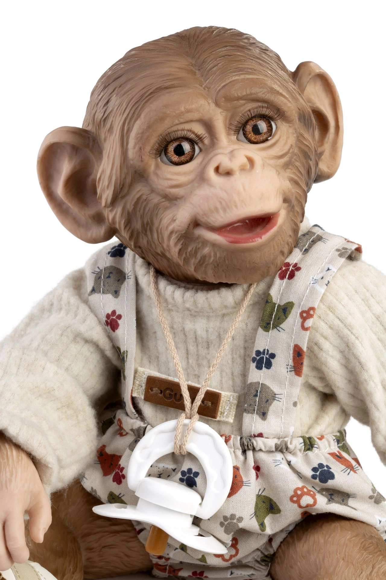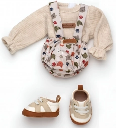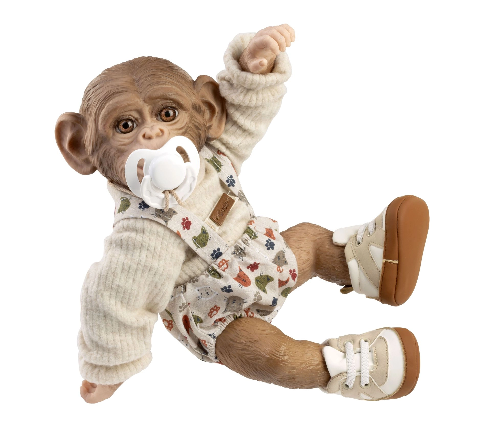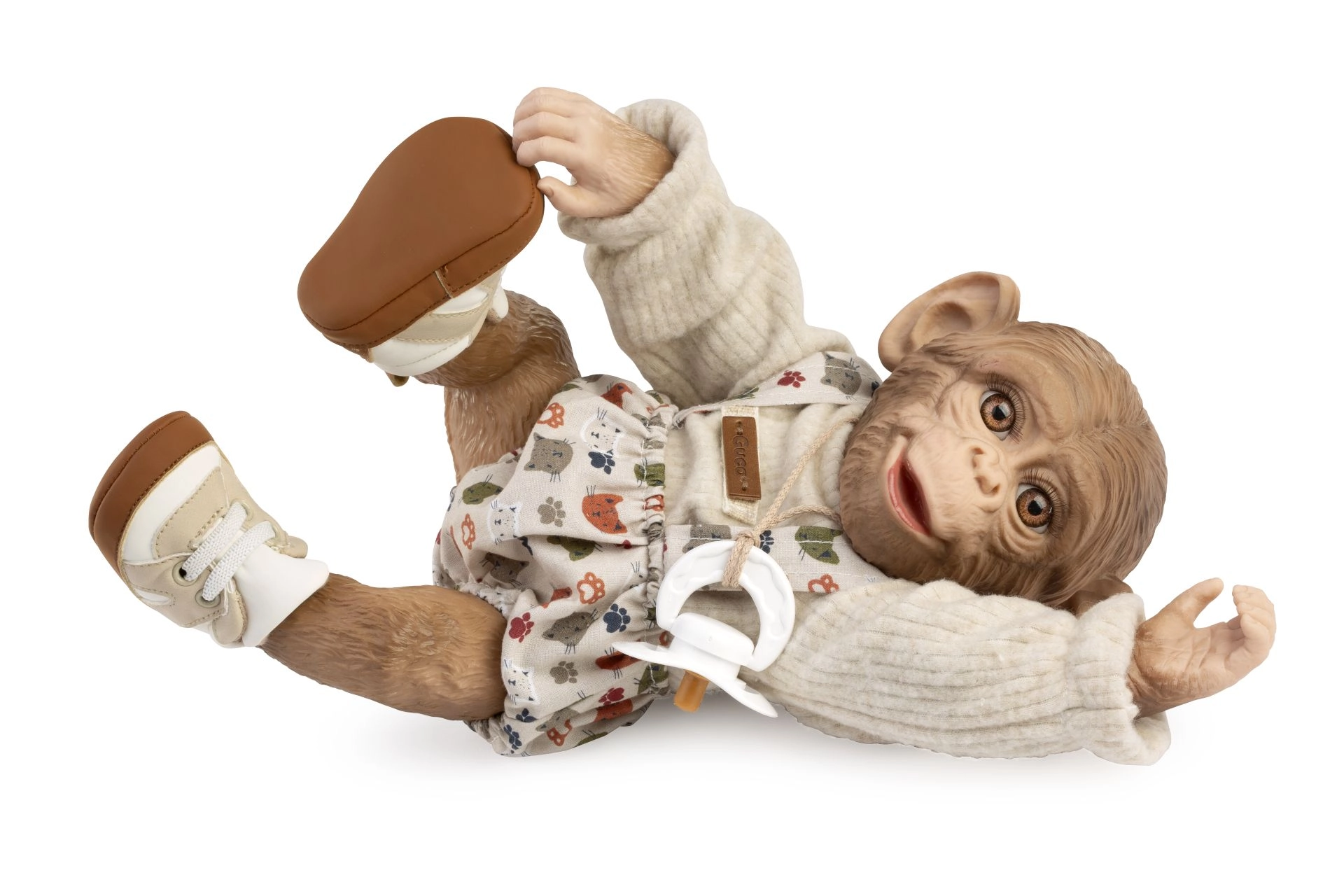 Dva diely oblečenia a čižmičky vytvárajú zladený outfit pre opičku bábätko REBORN s veľkosťou 32 cm – pripravené na hranie hneď po vybalení.