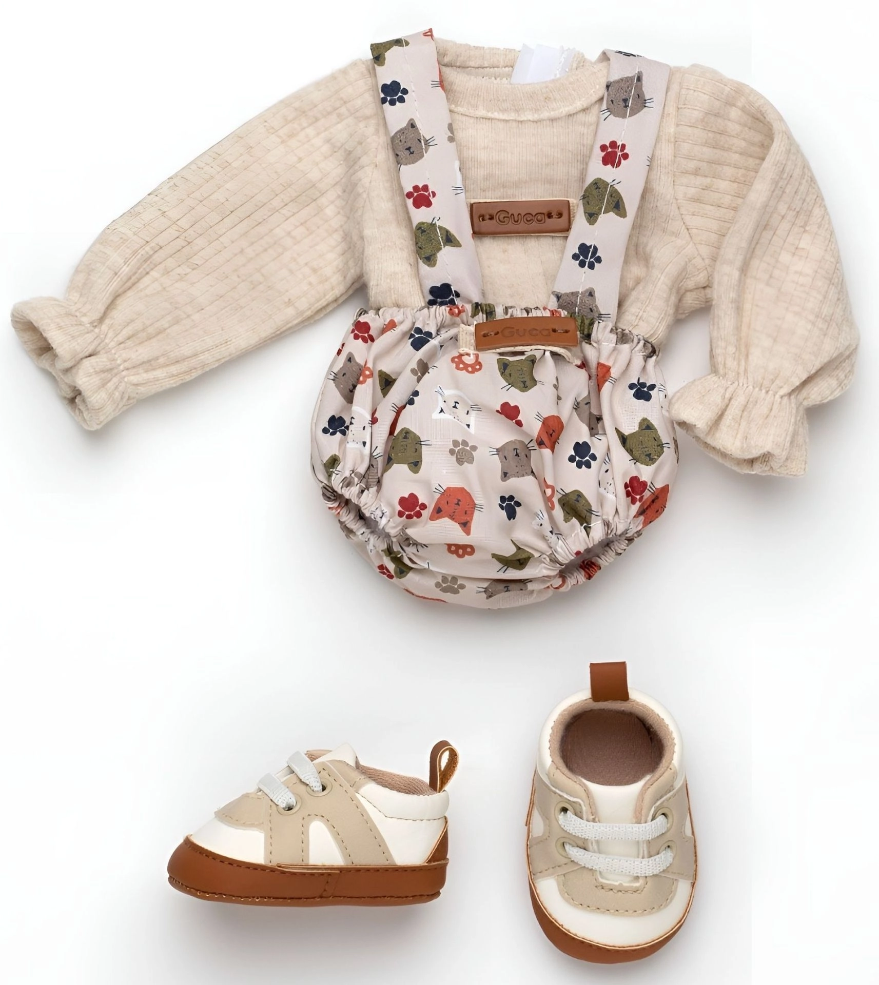 Doprajte svojej obľúbenej opičke bábätku REBORN nový šmrnc. Táto 3-dielna sada prináša dva zladené diely oblečenia a mäkké čižmičky, ktoré dodajú hre realistickosť a pohodlie. Vďaka ručnej výrobe v Španielsku sa môžete spoľahnúť na precízne spracovanie a kvalitné materiály.