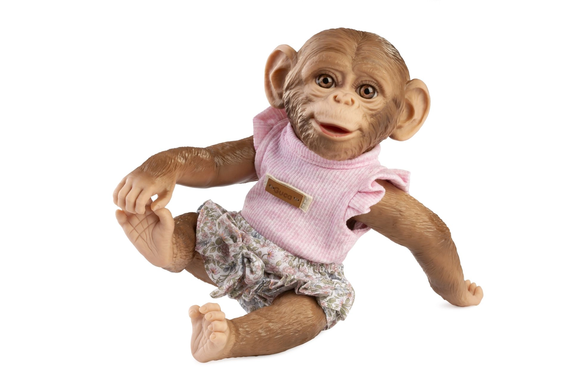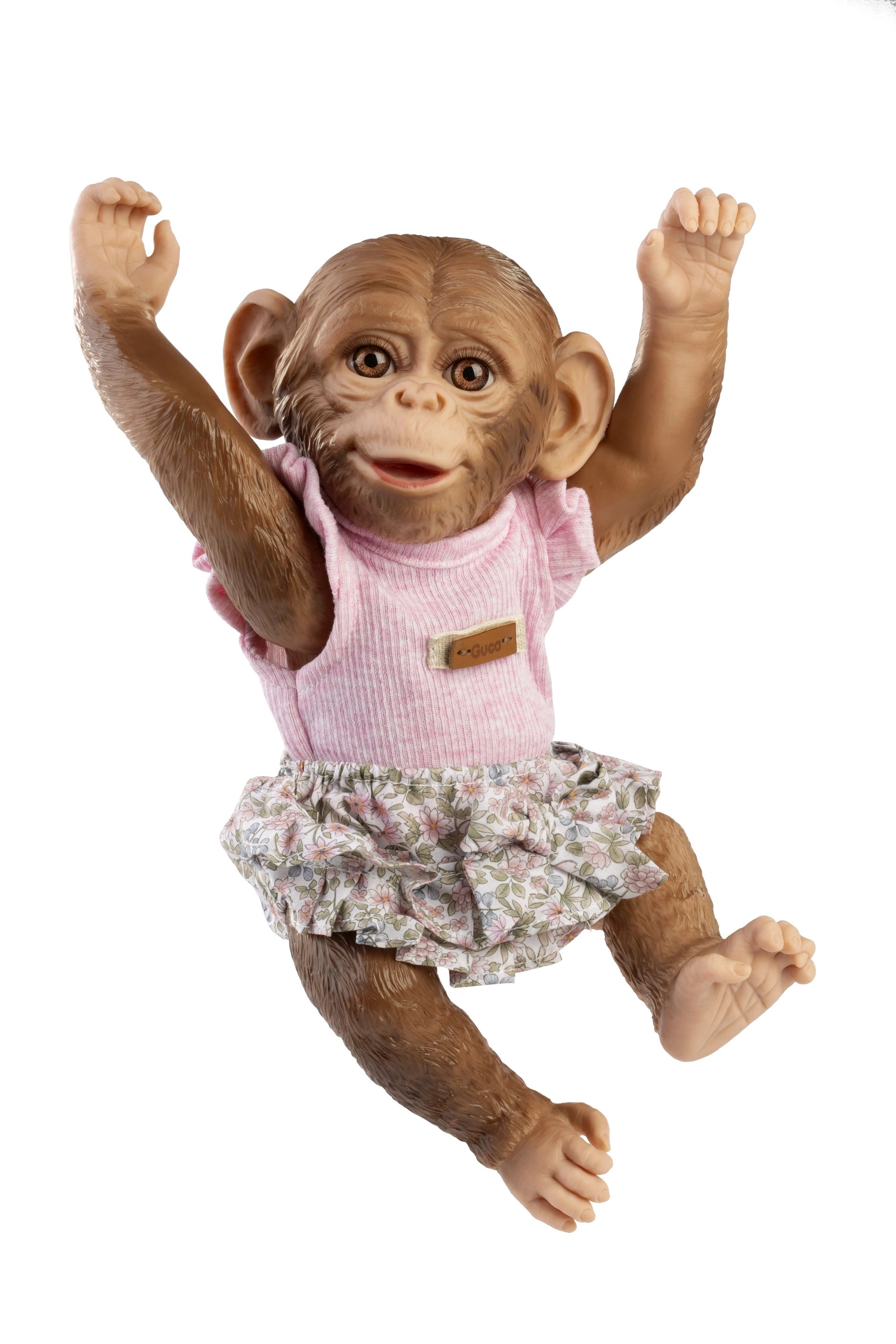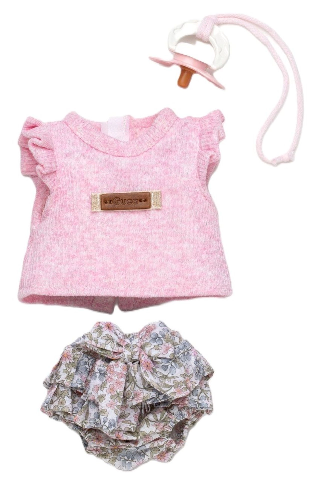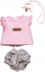 Roztomilá 3-dielna sada oblečenia pre opičku bábätko Reborn vo veľkosti 32 cm obsahuje ružový top, kvetované nohavičky/bloomers a cumlík s textilnou slučkou. Sada je ručne vyrobená v Španielsku, príjemná na dotyk a ideálna na nápaditú hru a prezliekanie. Vhodné pre deti od 3 rokov.