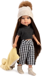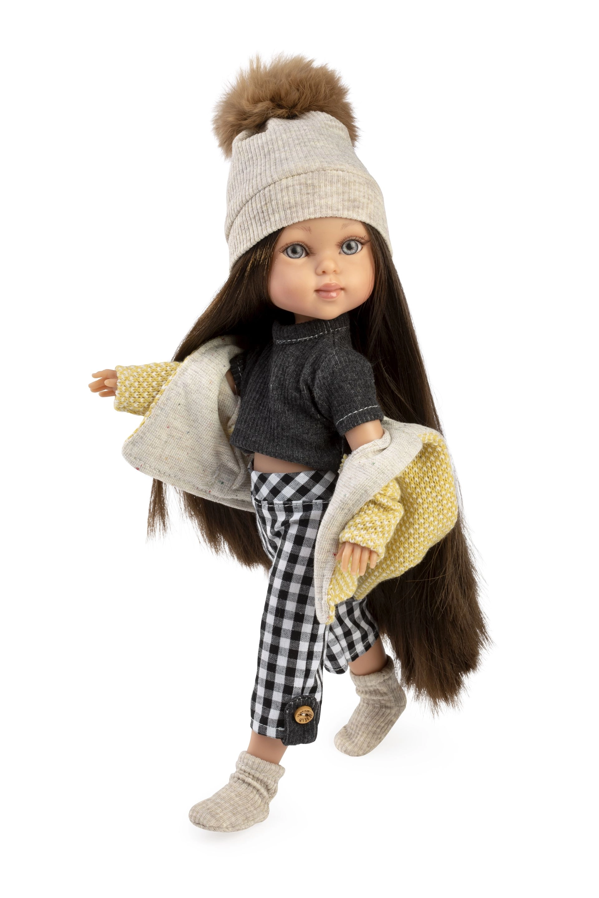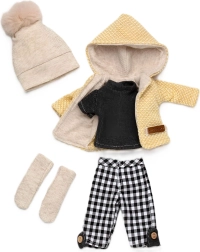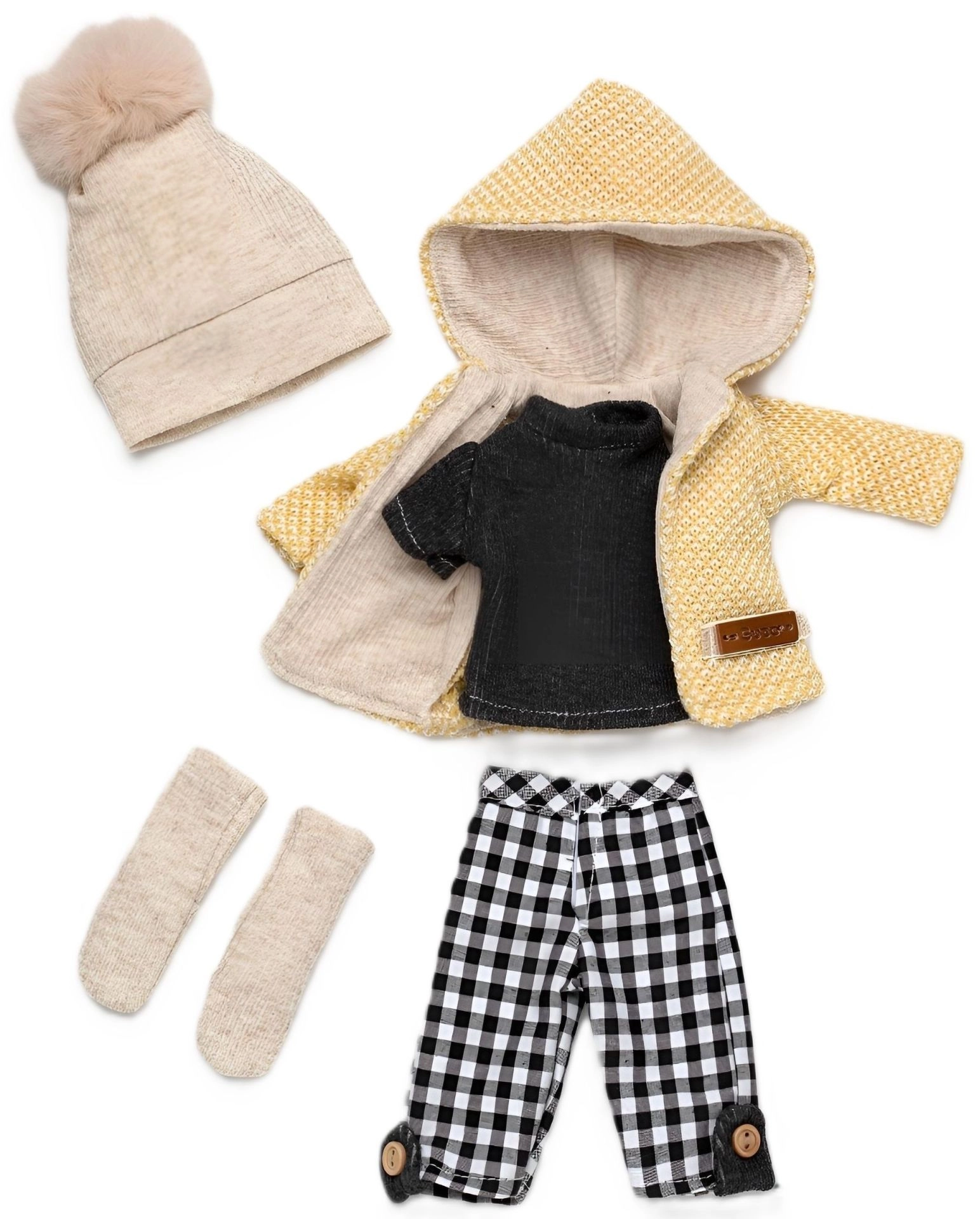Obohaťte šatník svojej bábiky Penelope o starostlivo zladenú 5‑dielnu kolekciu, ktorá kombinuje moderný károvaný vzor s hrejivými pleteninami. Set zahŕňa žltú kapucňovú bundičku s mäkkou podšívkou, pletenú čiapku s brmbolcom, čierne tričko, kárované nohavice s gombíkovými detailmi a pletené ponožky/návleky. Všetko je navrhnuté tak, aby sa dalo ľahko obliekať aj vyzliekať.