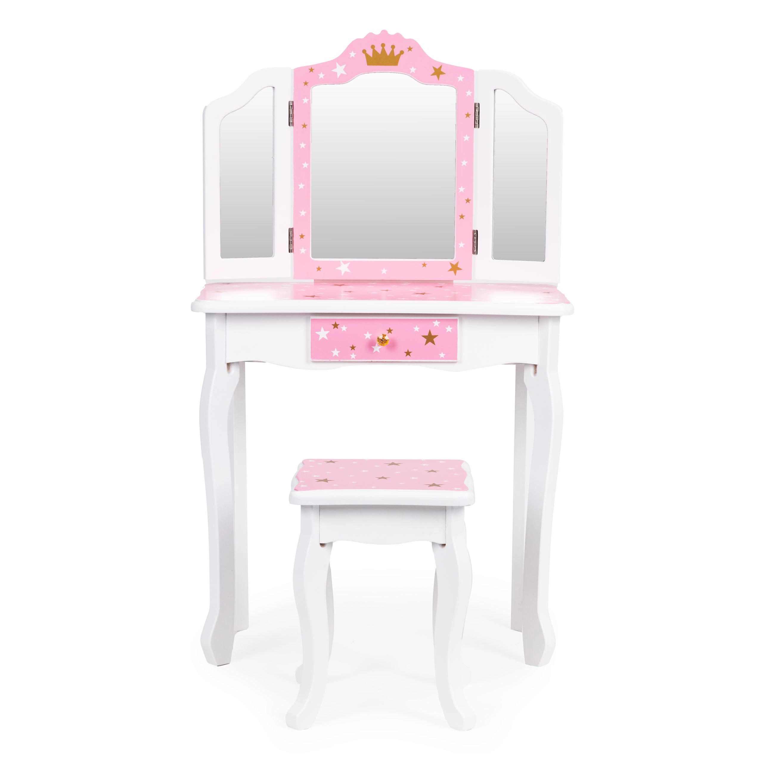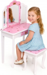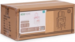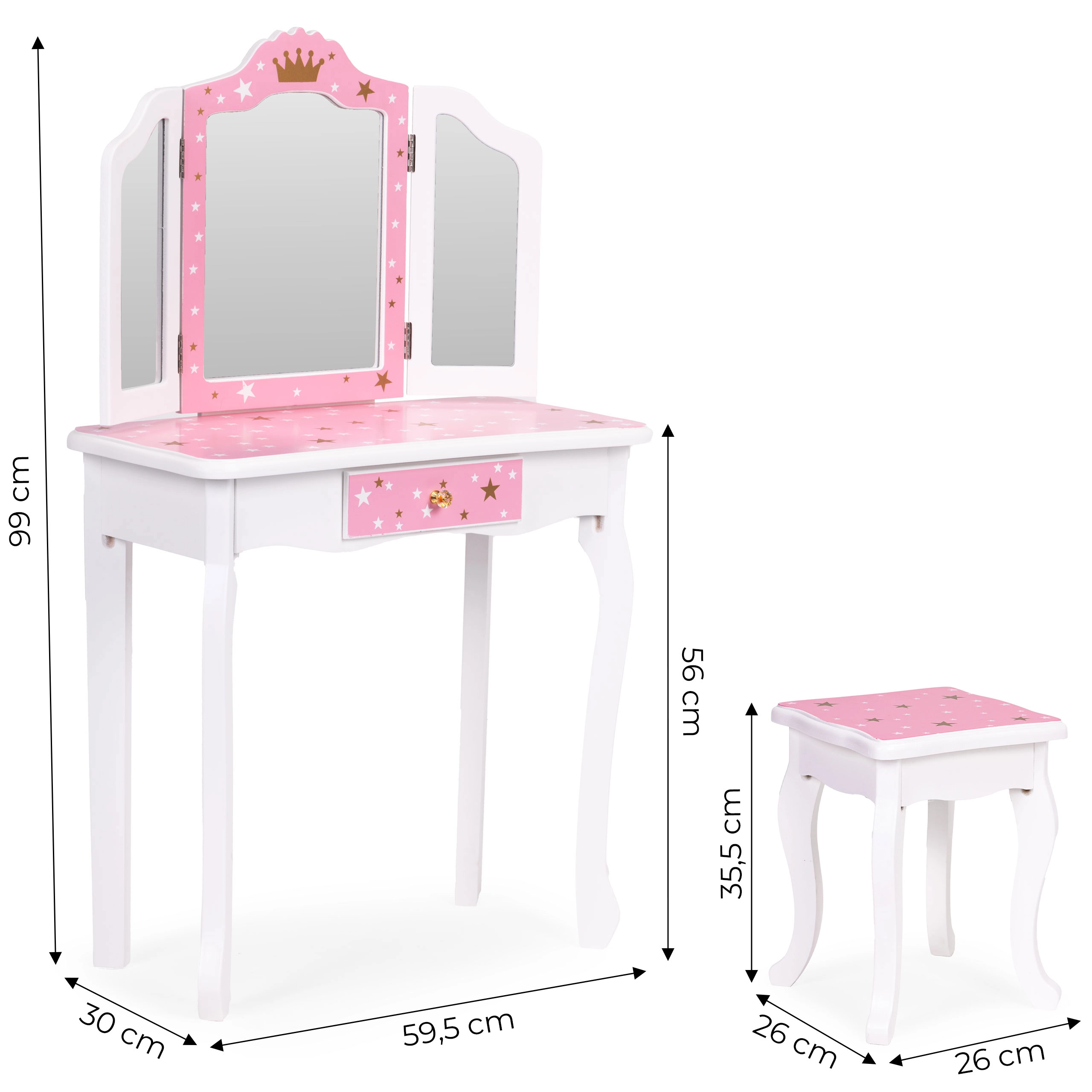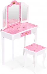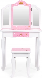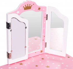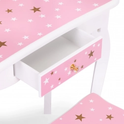 Vytvorte v detskej izbe čarovný kútik krásy. Toaletný stolík ECOTOYS kombinuje funkčnosť a rozprávkový dizajn: veľké stredové zrkadlo dopĺňajú dve bočné sklopné krídla na pohľad z rôznych uhlov, zatiaľ čo praktická zásuvka ukryje sponky, gumičky aj detské doplnky. Set dopĺňa stabilná stolička zladená s dizajnom.