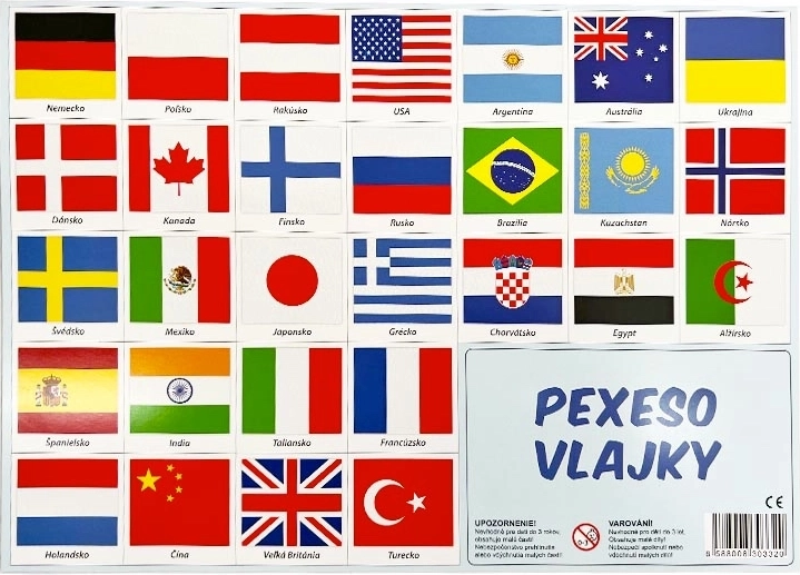 Obľúbená spoločenská hra pre deti aj dospelých, ktorá trénuje pamäť a rozširuje znalosti o krajinách sveta. Obsahuje 32 dvojíc s motívmi vlajok štátov, ideálne na zábavné učenie aj rodinné hranie.