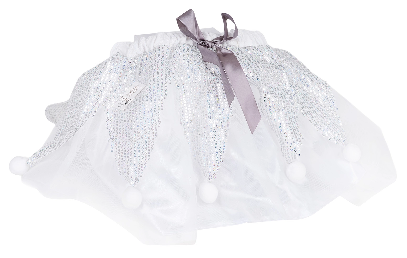 Dieťa získa tutu sukňu v rovnakom dizajne ako bábika – trblietavý tyl, flitre a hravé bambuľky pre čarovný vzhľad.