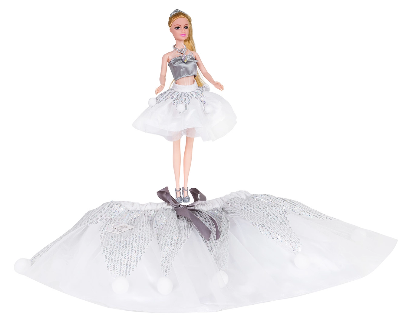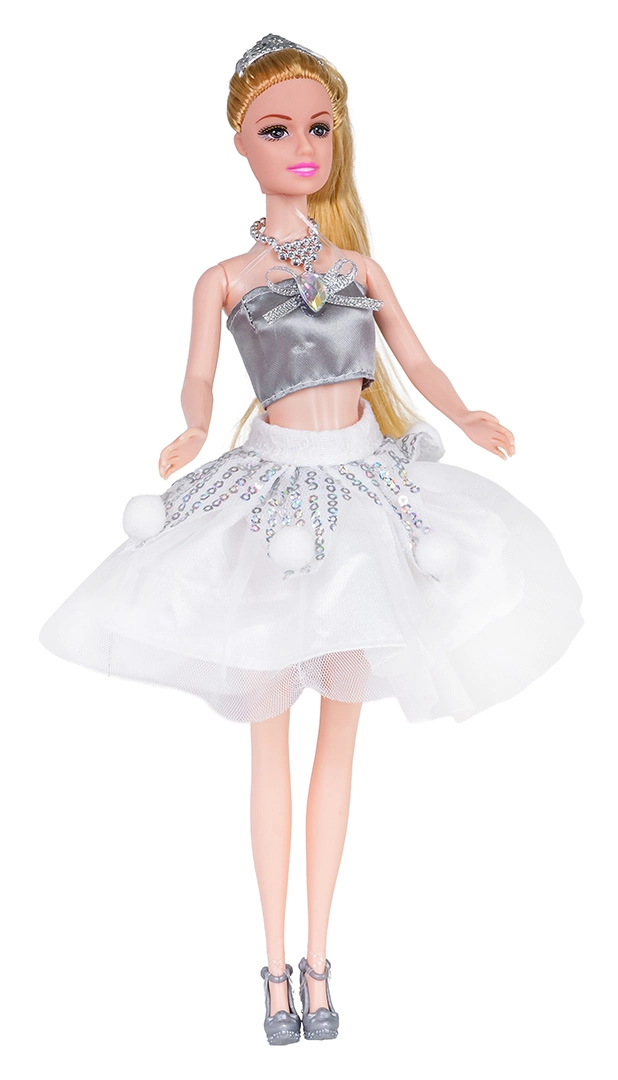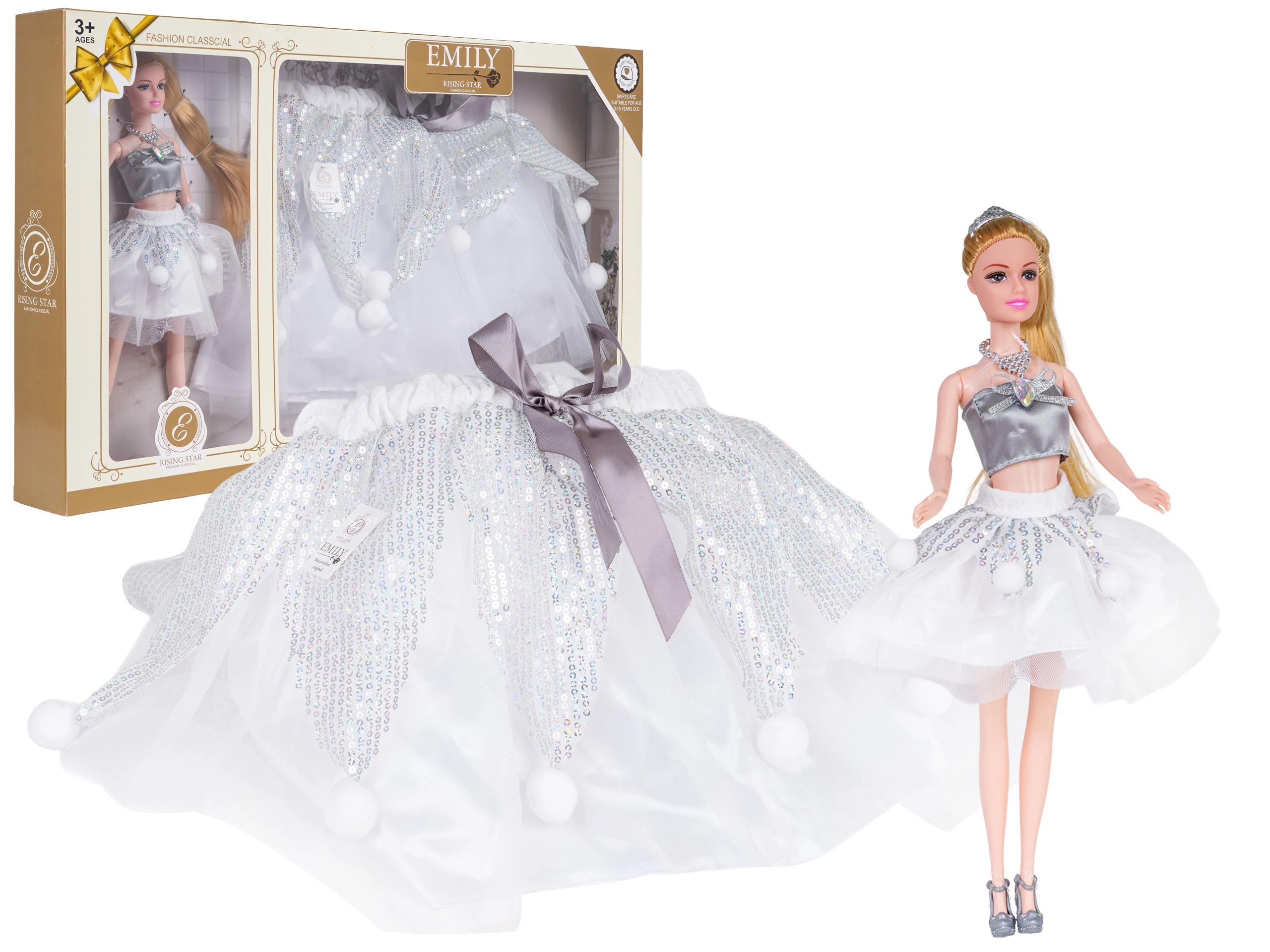 Sada bábika + detská sukňa prináša zladený vzhľad na hru aj kostýmy. Bábika je oblečená do trendy topu a trblietavej tylovej sukničky, má dlhé blond vlasy, ktoré možno česať a upravovať, a strieborné topánky. V rovnakom štýle získa aj dieťa vlastnú nadýchanú tutu sukňu s flitrami a hravými bambuľkami, aby sa cítilo čarovne.