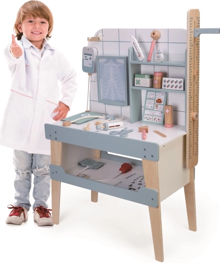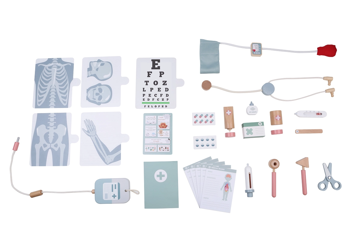 Táto role-play sada podporuje predstavivosť, spoločenskú interakciu a pomáha odbúrať strach z návštevy lekára. Reálne pomôcky z kvalitného dreva a ďalších materiálov učia deti rozpoznávať lekárske nástroje, plánovať vyšetrenia a starať sa o „pacientov“.
