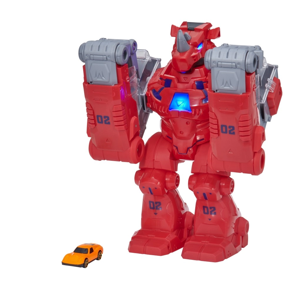 - Svetlá a zvuky – LED efekt očí a hrude, realistické robotické aj „nosorožie“ zvuky.