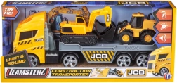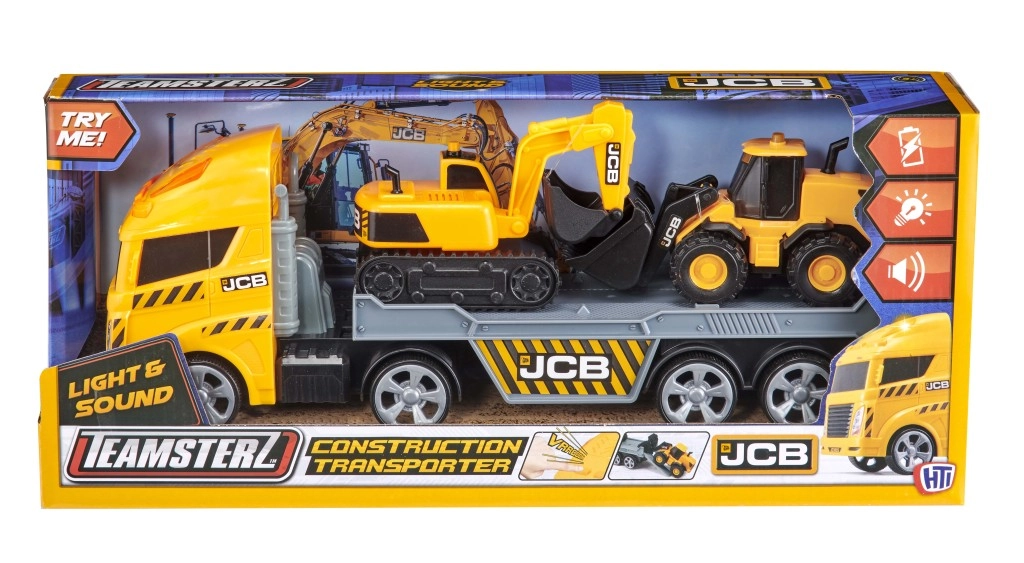 JCB transportný set prináša deťom realistický zážitok zo stavby: žltý transportér s blikajúcimi svetlami a zvukmi motora, voľne pohyblivé kolesá a dvojicu strojov – bager a kolesový nakladač s ručne ovládanými lyžicami pre kreatívnu hru a rozvoj jemnej motoriky.