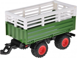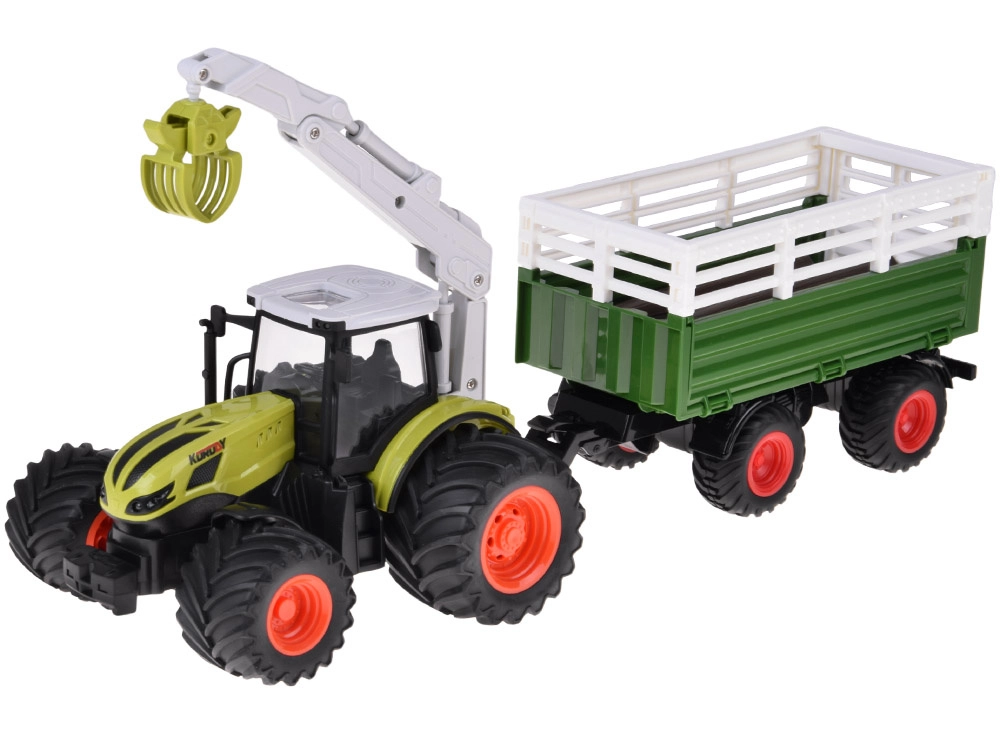 Ovládač s frekvenciou 2,4 GHz zaisťuje stabilné riadenie bez rušenia, nechýba režim DEMO a možnosť zapnutia/vypnutia svetiel. Príves je odpojiteľný, má sklápaciu korbu aj otváracie bočnice a zadné čelo pre jednoduché nakladanie. V balení nájdete všetko potrebné vrátane nabíjacieho akumulátora a USB kábla – stačí vložiť batérie do ovládača a vyraziť na farmu.
