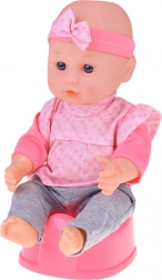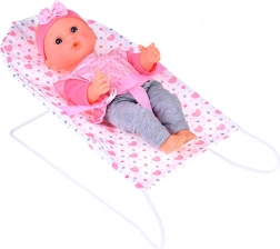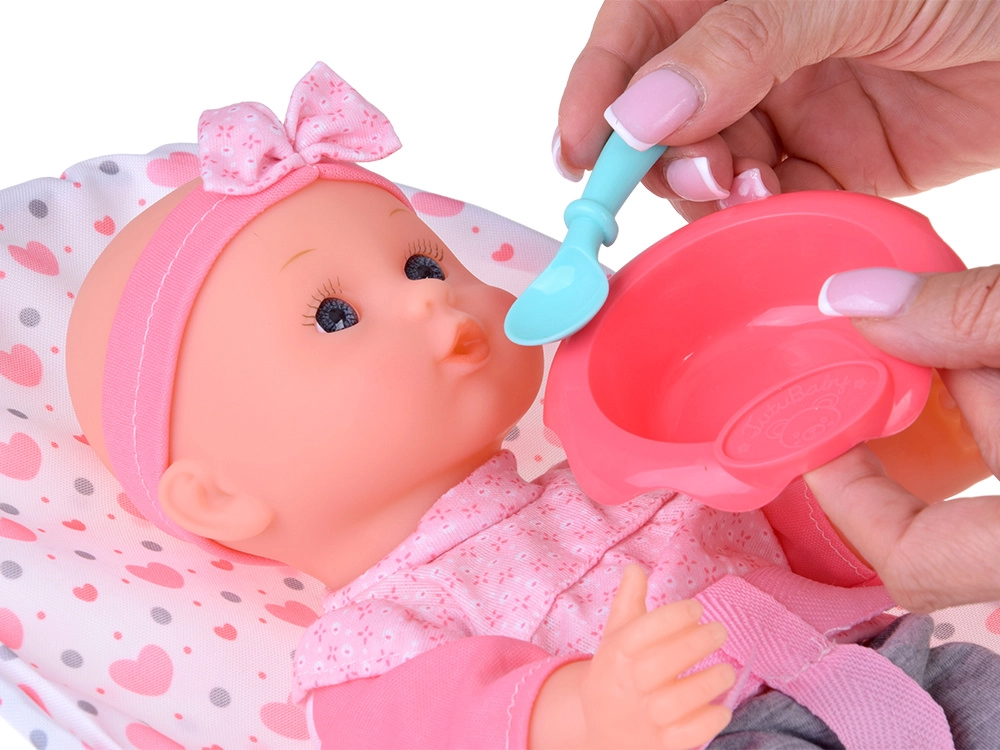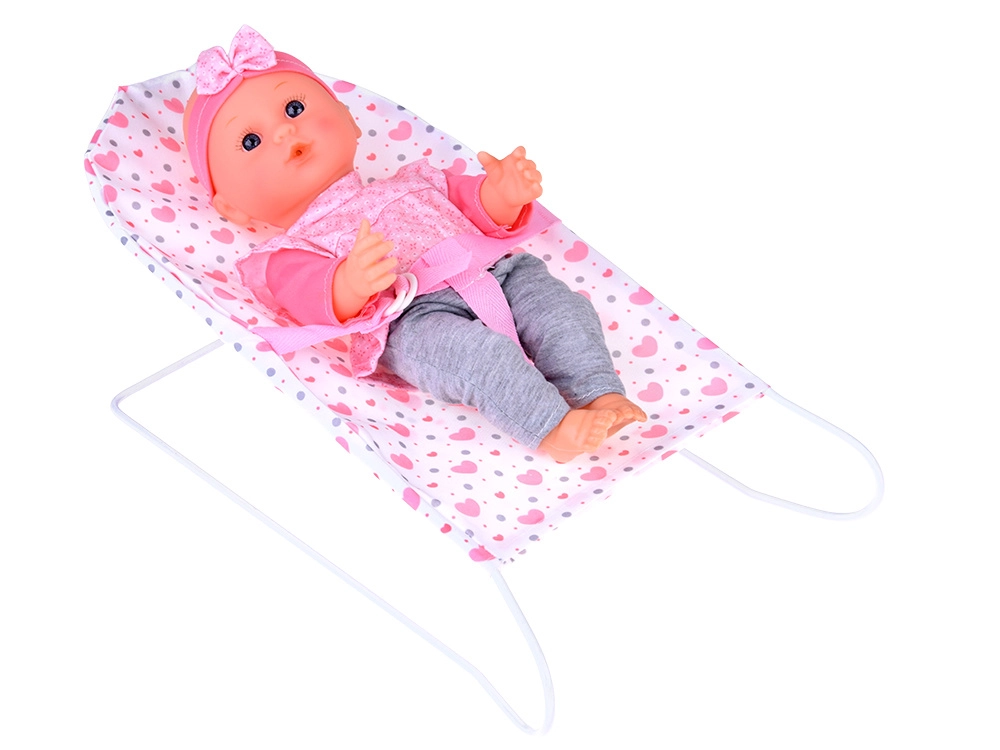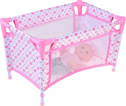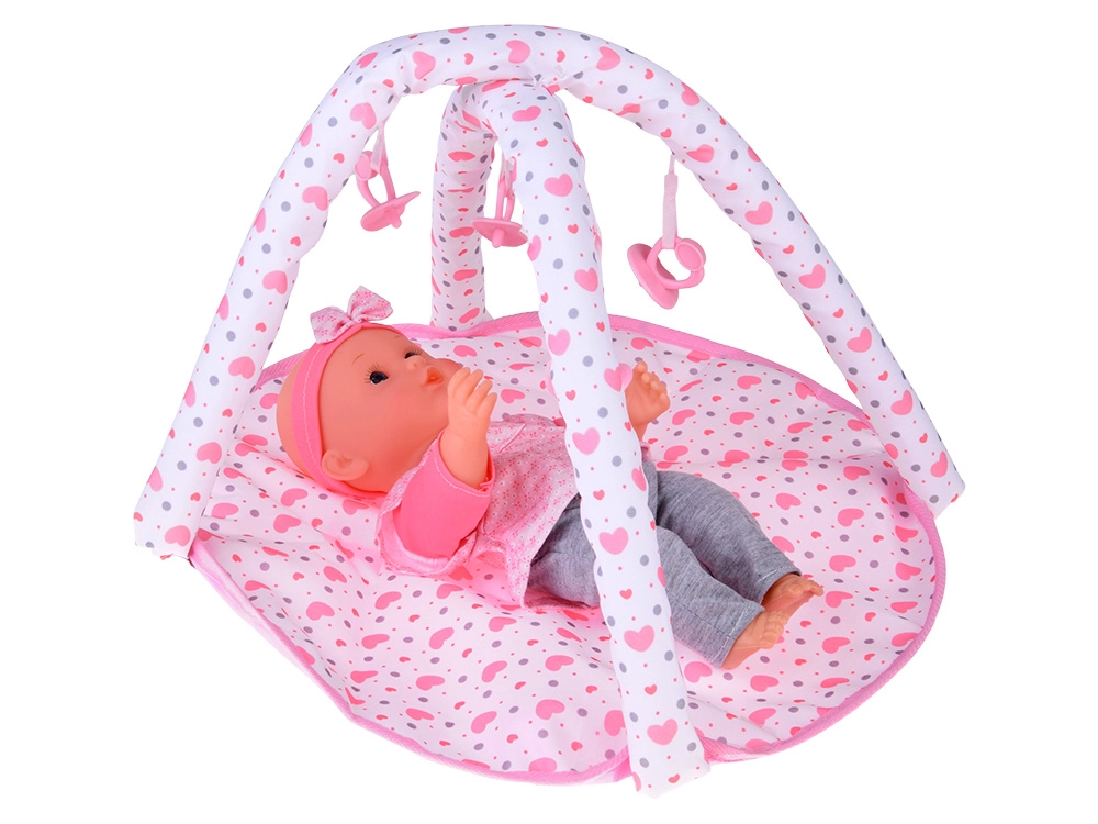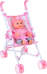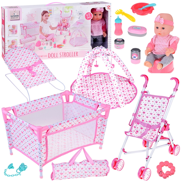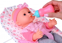 Urobte deťom radosť premyslenou sadou na starostlivosť o bábiku. Súčasťou je bábätko s pohyblivými končatinami a mäkkým oblečením, praktická cestovná postieľka s puzdrom, pohodlné ležadlo s bezpečnostným pásom, hracia podložka s hrazdou a skladací kočík – „dáždnik“. Nechýba nočník, fľaša, miska s lyžičkou a vidličkou, hrkálka, cumlík na retiazke, krémové a toaletné „dózy“ a taška na doplnky.