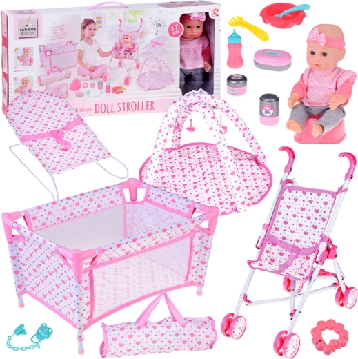 Celá kolekcia je zladená do jemných, pastelových farieb s motívom srdiečok a bodiek, takže pôsobí veľmi útulne a štýlovo. Vďaka ľahkej kovovej konštrukcii kočíka a jednoduchému skladaniu je hra aj ukladanie hračiek pohodlné a bezpečné. Sada rozvíja empatiu, predstavivosť a sociálne zručnosti detí.